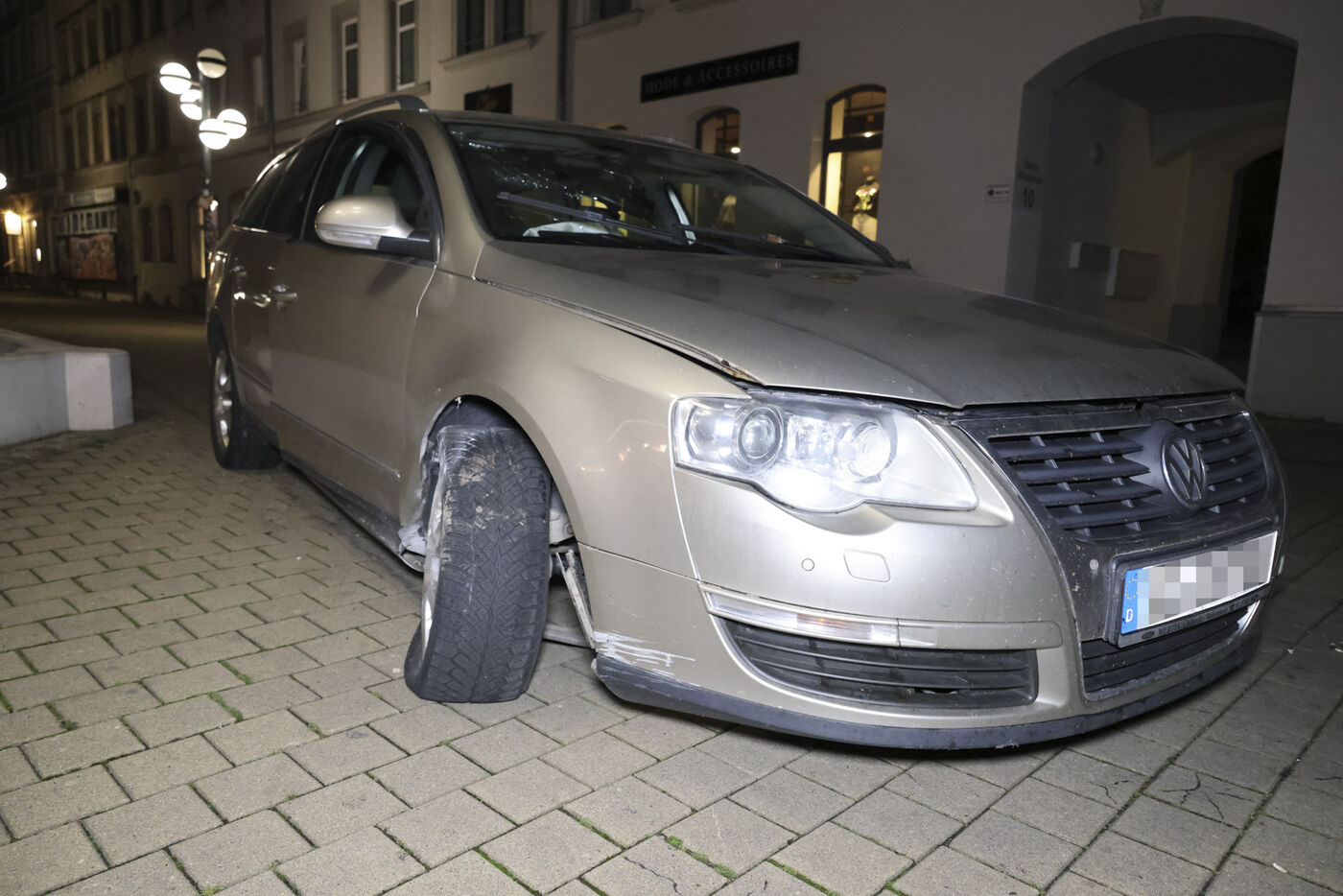 Die Fahrt in der Fußgängerzone geht allerdings nicht weit. Nur wenige Meter, dann macht eine Beton-Einpflanzung Schluss mit dem Abenteuer. Kein Mensch verletzt, aber der Wagen hat jetzt eine ordentliche Delle. Als die Polizei anrückt, steht das Auto verlassen da.