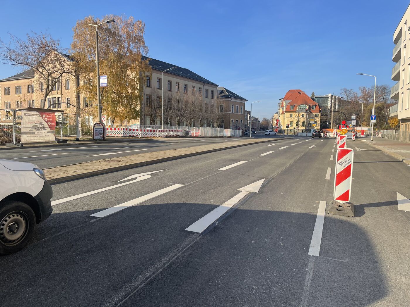 Reichlich ein Vierteljahr sorgte diese Baustelle für Staus rund um die Hauptfiliale der Zwickauer Sparkasse. Seit Freitag ist sie Geschichte. Vermutlich am Vormittag wurde die Humboldtstraße für den Verkehr freigegeben. Abgesehen von der rechten Spur in Richtung Crimmitschau sind alle Einschränkungen aufgehoben.