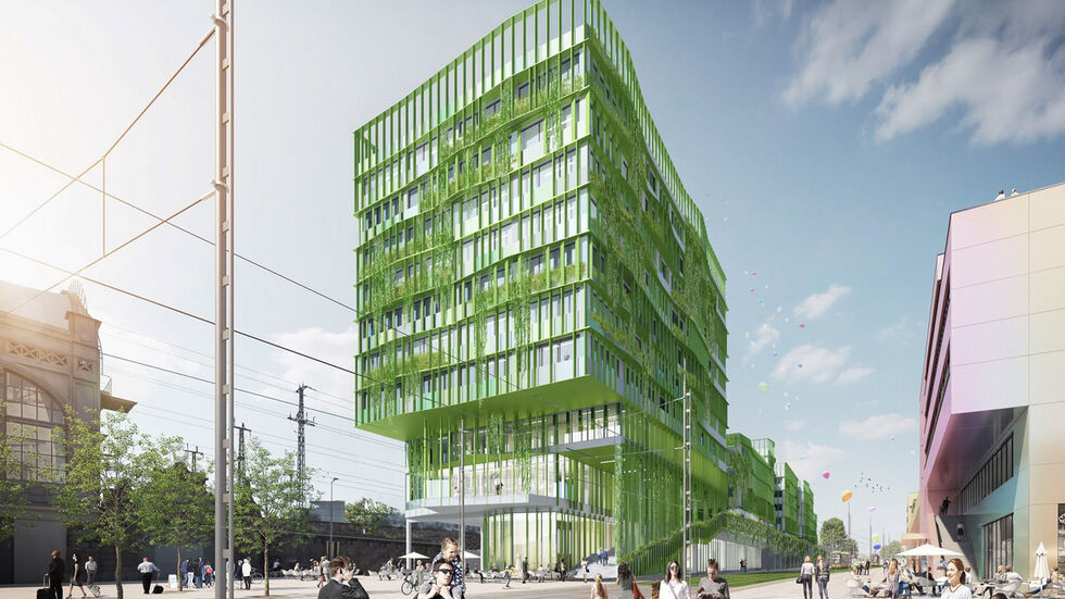 Bei der Fassadengestaltung ist eine vertikale Pflanzen-Rankstruktur für die Gebäudehülle geplant, an der Pflanzen nach oben und unten wachsen. Hinzu kommen intensiv begrünte Dächer mit Photovoltaikanlagen und weitläufige Dachterrassen als gemütliches Freiluftareal in Ergänzung der Arbeits- und Büroflächen in den oberen Geschossen.