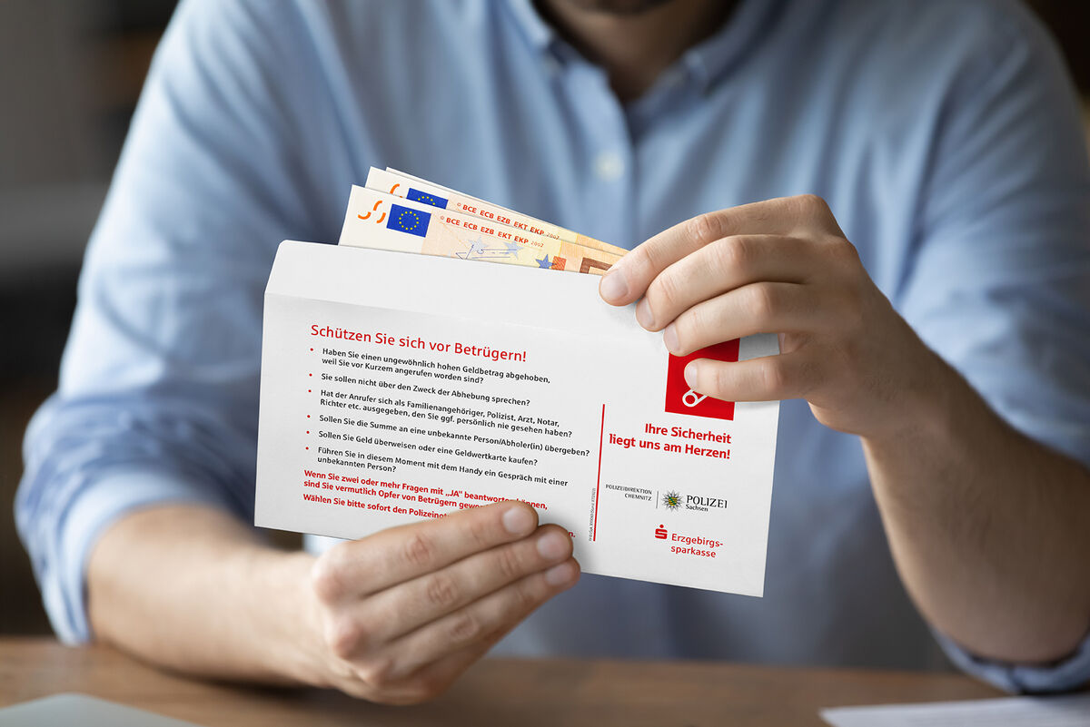 Wer sich in einer Filiale der der Erzgebirgssparkasse größere Geldbeträge auszahlen lässt, bekommt ab sofort eine Betrugswarnung mit. Die Idee wurde in Zusammenarbeit mit der Polizei umgesetzt, und es gibt gute Gründe.