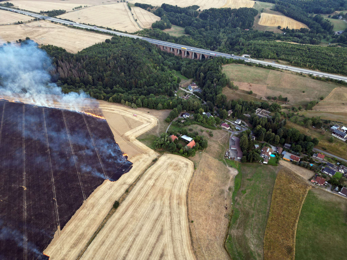 Auf einem Getreidefeld an der A4 nahe Hainichen hat es am Montagabend gebrannt. Laut Polizei war das Feuer bei Erntearbeiten ausgebrochen und hatte sich auf rund vier Hektar Fläche ausgebreitet. Der Qualm war von der Autobahn aus zu sehen. Die Feuerwehr löschte.