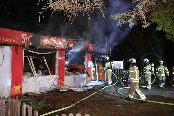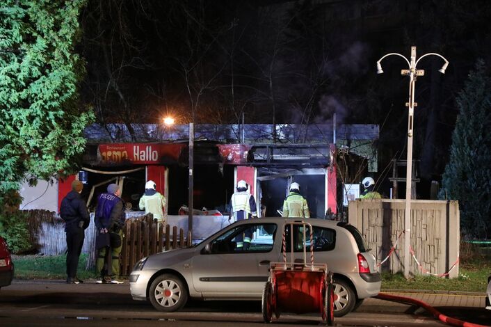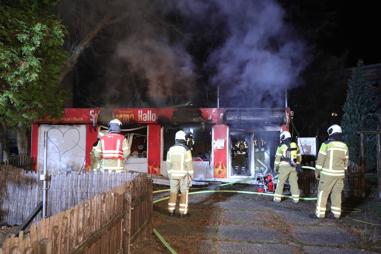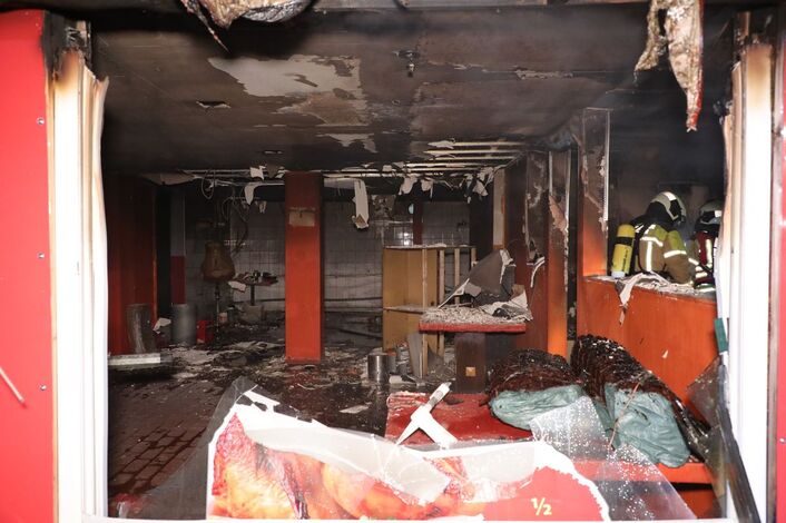 Die Feuerwehr im Löscheinsatz an eheamligem Döner-Imbiss in Prohlis