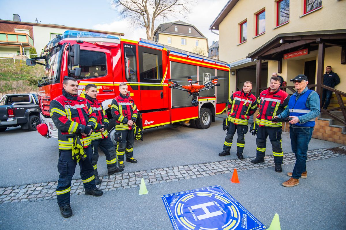 Die Beierfelder Feuerwehrleute lernen den Umgang mit der Drohne.