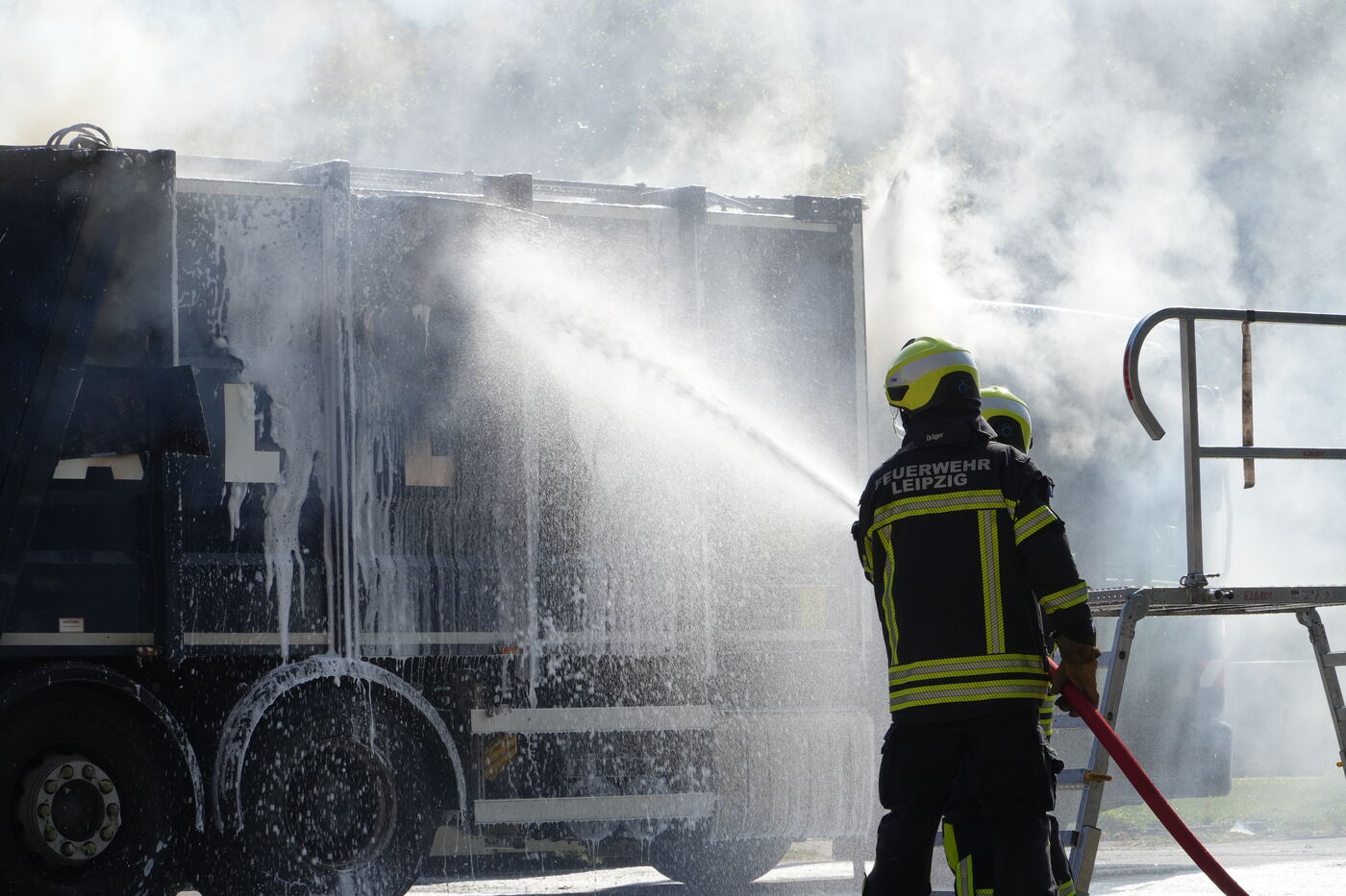 Feuerwehrleute beim Löschen des brennenden Müllfahrzeuges.