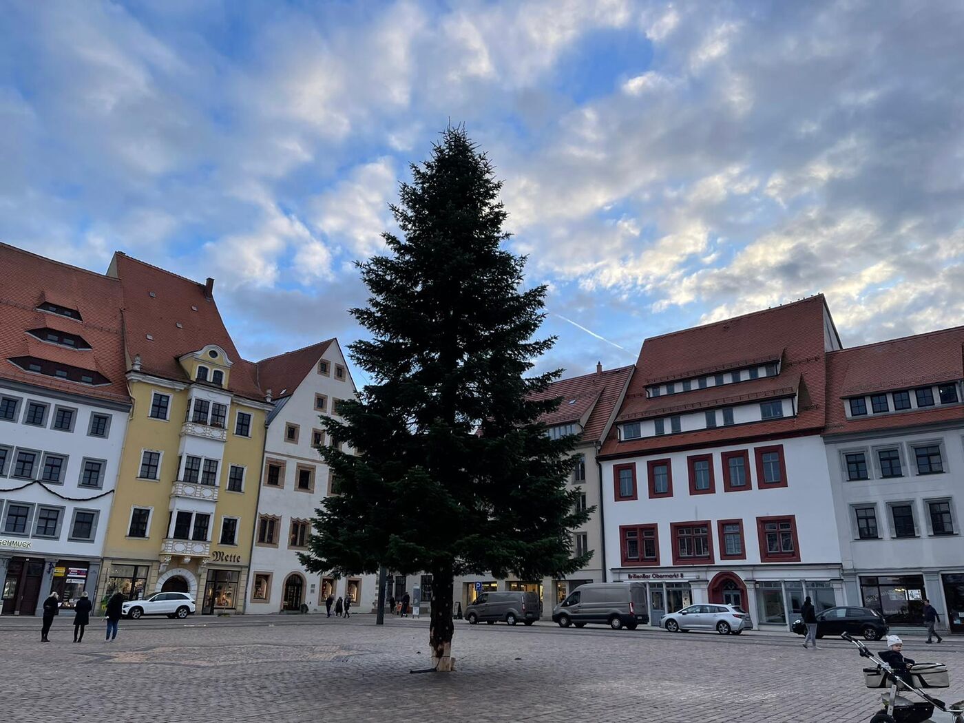 Seit Montag steht der Weihnachtsbaum auf dem Freiberger Obermarkt.