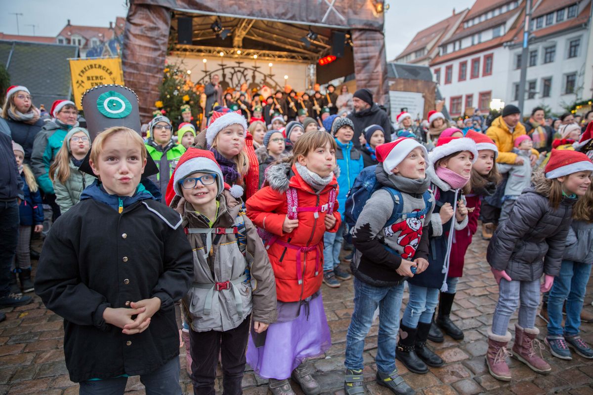 Über 180 Kita-Kinder schoben gemeinsam die bergmännische Pyramide an und „pusteten“ Lichterglanz in den 16 Meter hohen Weihnachtsbaum auf dem Obermarkt.