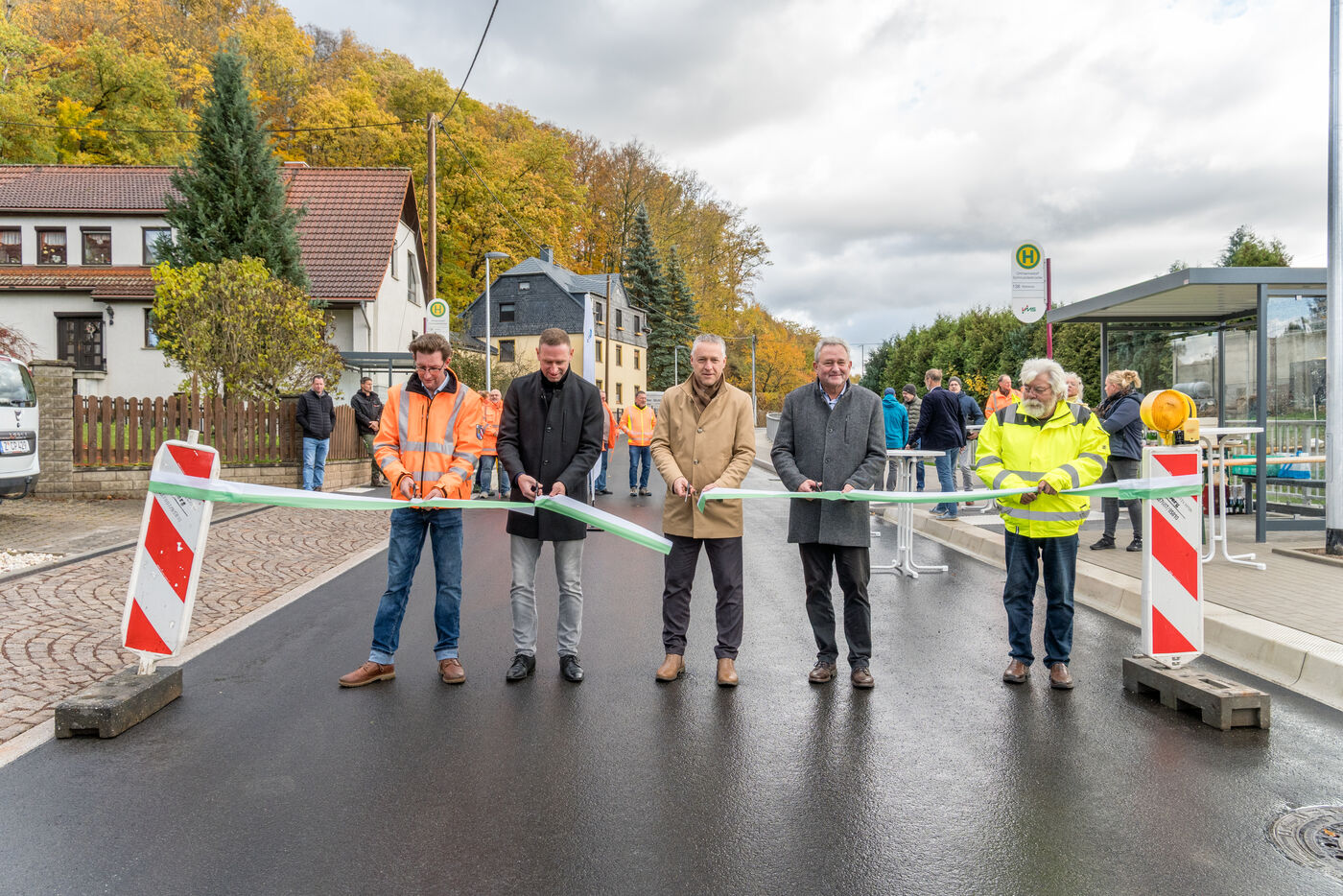 Landrat Carsten Michaelis (Mitte) und Bürgermeister Michael Franke (2.v.r.) haben die Straße feierlich für den Verkehr freigegeben.