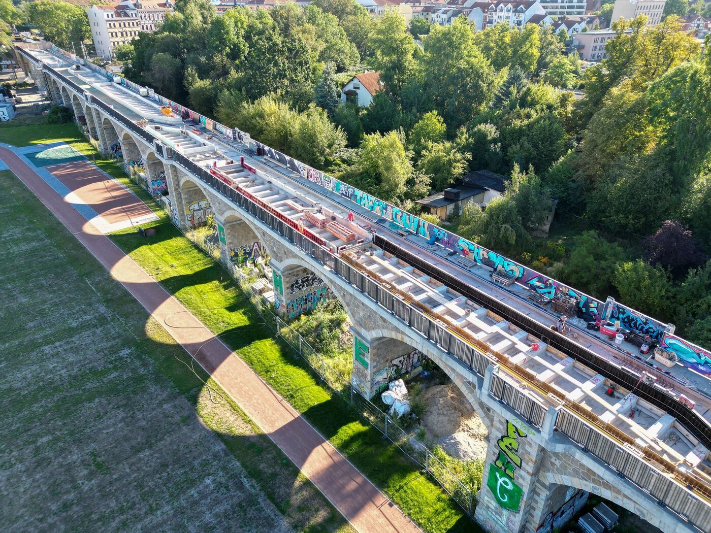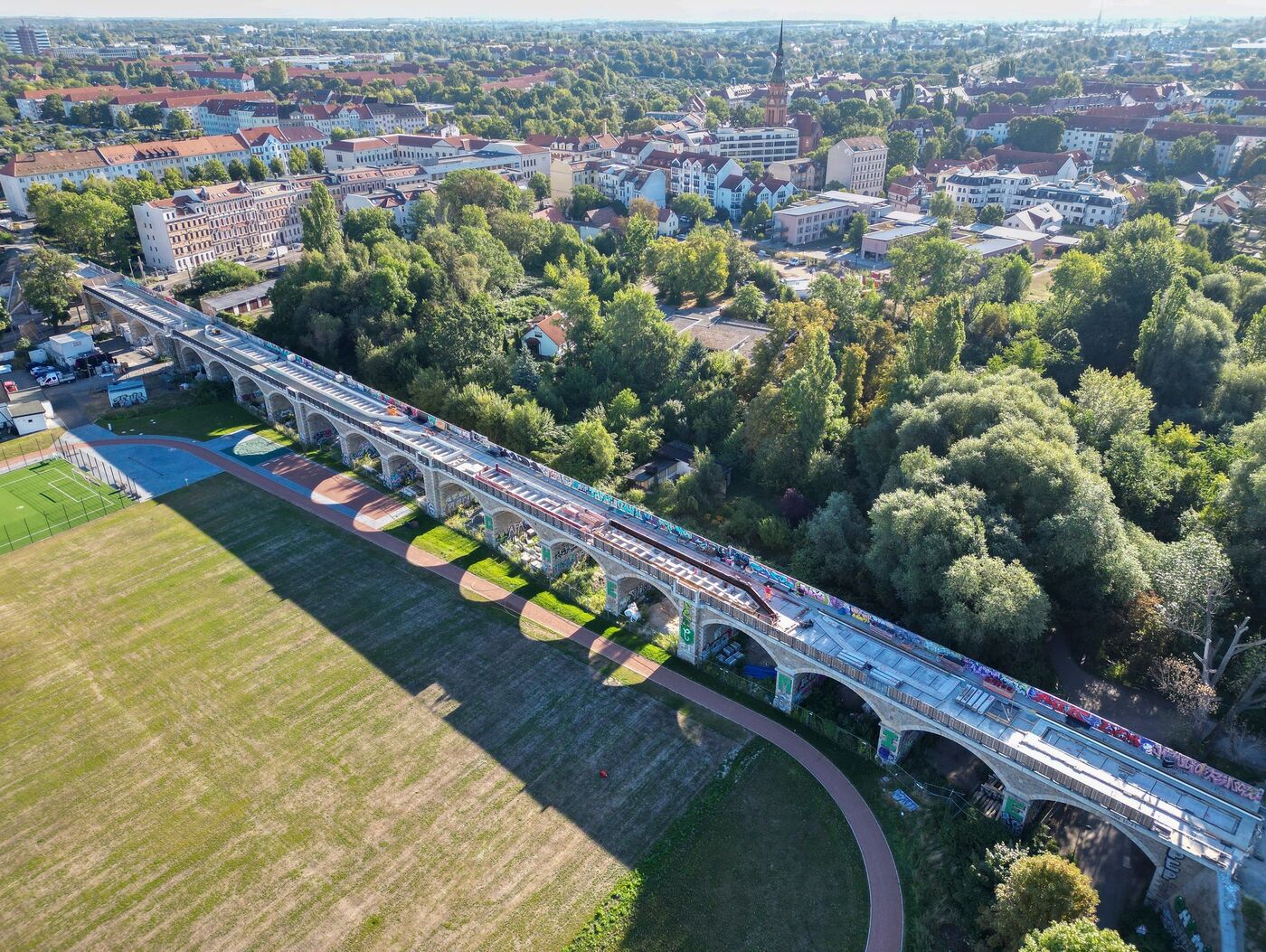 Bis zur zweiten Jahreshälfte des kommenden Jahres sollen die Arbeiten an dem alten Eisenbahnviadukt abgeschlossen sein. Die Gesamtkosten dafür belaufen sich laut Stadt auf rund acht Millionen Euro. Parallel dazu laufen die Bauarbeiten an einer neuen Brücke für Fußgänger und Radfahrer für 2,5 Millionen Euro unweit des Viadukts an der Leipziger Eisenbahnstraße.