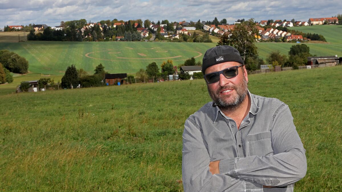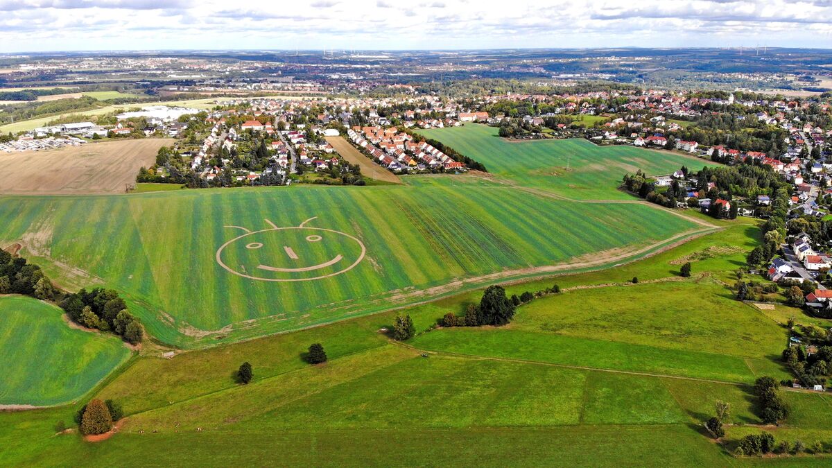 Landwirt Karel Heinz hat genug von der schlechten Laune vieler Zeitgenossen. „Es gibt überall Probleme auf der Welt. Da wollte ich mal etwas Positives weitergeben“, erklärt der Bauer aus Zwickau-Rottmannsdorf seine Motivation für das Grinsegesicht, das er in ein abgeerntetes Rapsfeld gegrubbert hat.