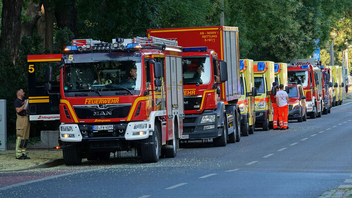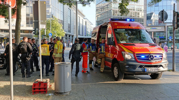 Blaulicht und Sirenen am Dienstagabend in der Dresdner Innenstadt. Polizei und Feuerwehr rückten mit einem Großaufgebot an Fahrzeugen an. Vor der Centrum Galerie auf der Prager Straße hat es nach 18 Uhr eine Schlägerei gegeben.