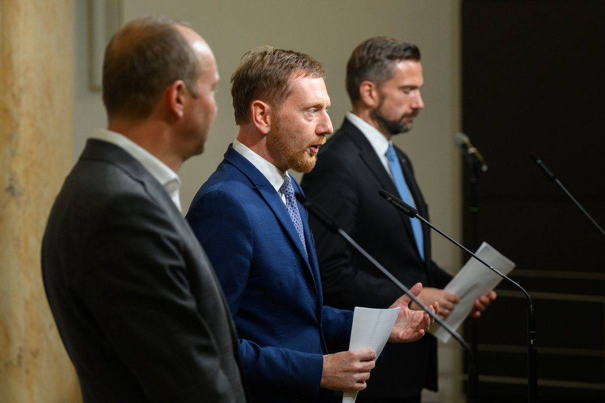 - Ministerpräsident Michael Kretschmer ( M), Umweltminister Wolfram Günther und Wirtschaftsminister Martin Dulig während einer Pressekonferenz nach dem Energiegipfel.
