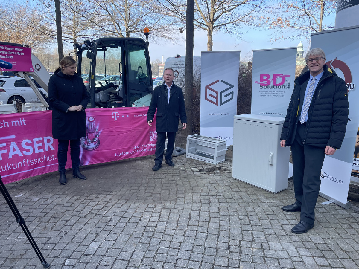 Die Telekom hat am Montagvormittag den Startschuss gegeben für den Ausbau des Glasfasernetzes in Zwickau. „Zwickau wird fit gemacht für die nächsten Jahrzehnte, eventuell Jahrhunderte“, sagte Oberbürgermeisterin Constance Arndt am Platz der Völkerfreundschaft. Ende des Jahres sollen rund 19.000 Haushalte die Möglichkeit haben, einen Anschluss zu nutzen und mit einer Geschwindigkeit von bis zu einem Gigabit pro Sekunde im Internet zu surfen.