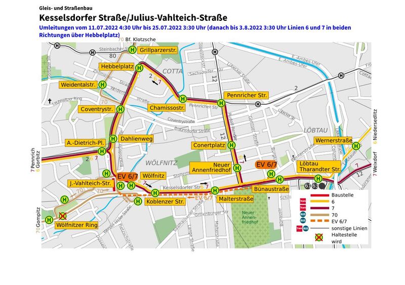 - Linie 70: Fährt über eine kleinräumige Umleitung am Baufeld vorbei. Stadtauswärts geht es über Amalie-Dietrich-Platz und Wölfnitzer Ring, stadteinwärts über Kesselsdorfer Straße und Wendel-Hippler-Straße
