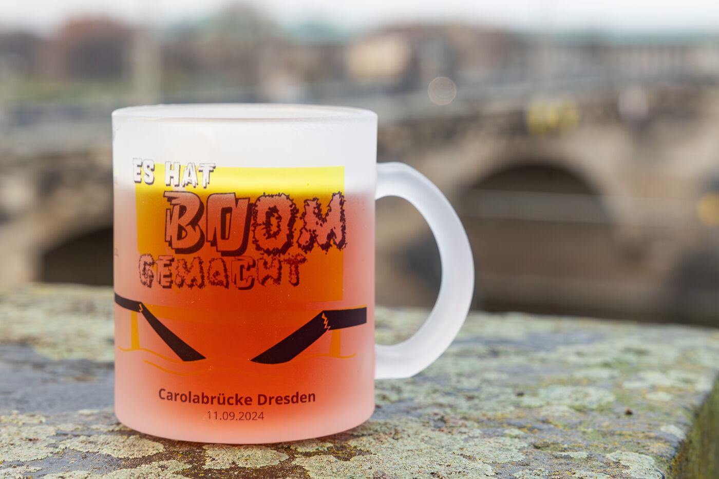 Der Einsturz der Dresdner Carolabrücke hat das Bauwerk über Nacht überregional bekannt gemacht - und zu einem Symbol für marode Infrastruktur in Deutschland. In der aufziehenden Glühwein-Saison werden der Brücke nun neue Weihen zuteil: In der Landeshauptstadt ist ihr eigens eine Tasse gewidmet. Sie trägt die Aufschrift „Es hat Boom gemacht“ und nehme so das Thema „mit Dresdner Humor auf - trocken, ehrlich und mit dem Blick nach vorn“, findet Mitinitiator Torsten Meisel.
