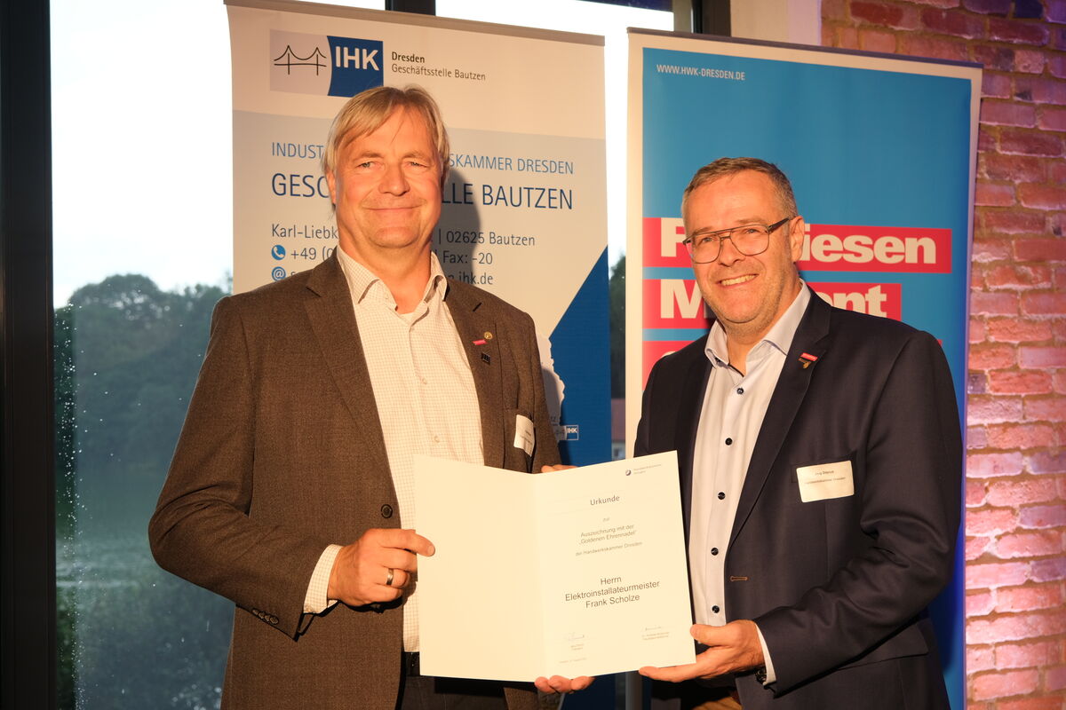 Er sei ein Macher und rund um das Handwerk unterwegs. Der Bautzener Elektroinstallateurmeister Frank Scholze ist mit der Ehrennadel der Handwerkskammer in Gold ausgezeichnet worden. Er wurde für seine außerordentlichen Verdienste geehrt. Der 61-Jährige bilde aus und engagiere sich aktiv im Ehrenamt: in der Elektrotechniker-Innung und der Kreishandwerkerschaft Bautzen. Scholze ist seit 2016 Kreishandwerksmeister.