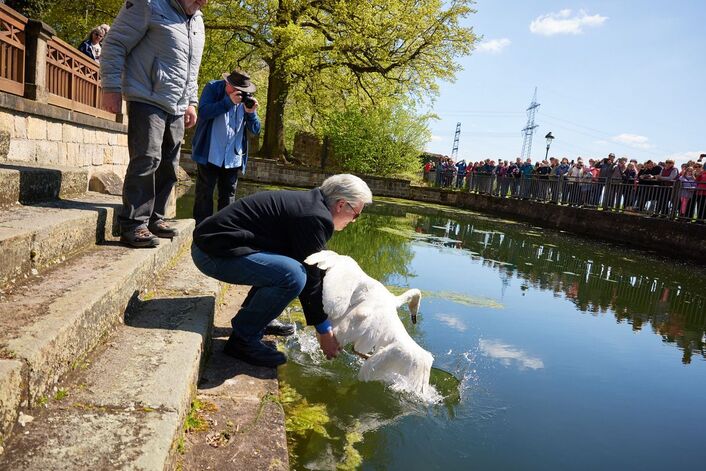 Schwanhilde ist eigentlich ein Pechvogel. Ende vergangenen Jahres hatte sie einen tragischen Unfall an der Wasserski-Anlage in Dresden-Leuben. Der Jungschwan war in ein Drahtseil geflogen. Ein Feuerwehrmann rettete das schwerverletzte Tier und brachte es in die Wildvogel-Auffangstation. Dort wurde Schwanhilde von Beringer und Schwanenexperte Thomas Eißer gesund gepflegt und aufgepäppelt. Weil beide Flügel gebrochen waren, kann sie allerdings nicht mehr fliegen.