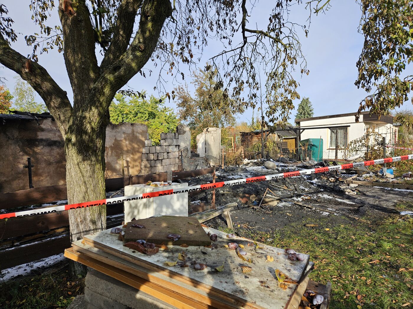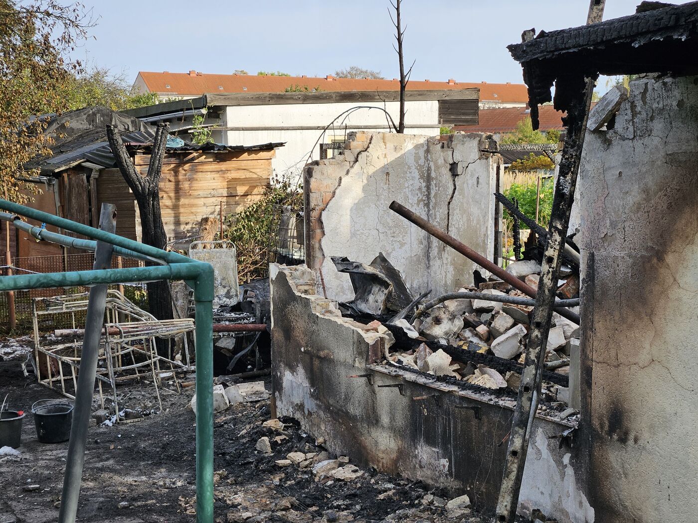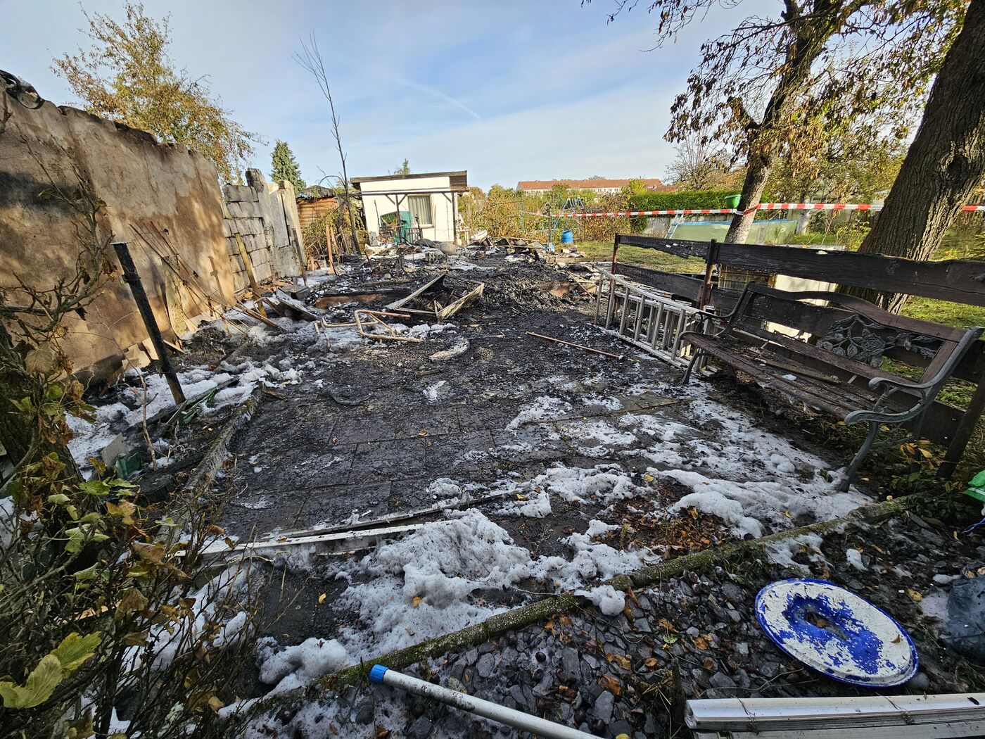 Im der Nacht zu Sonntag sind bei einem Brand im Leipziger Osten mehrere Gartenlauben vollständig niedergebrannt. Am Tag danach zeigen Bilder das Ausmaß der Katastrophe.