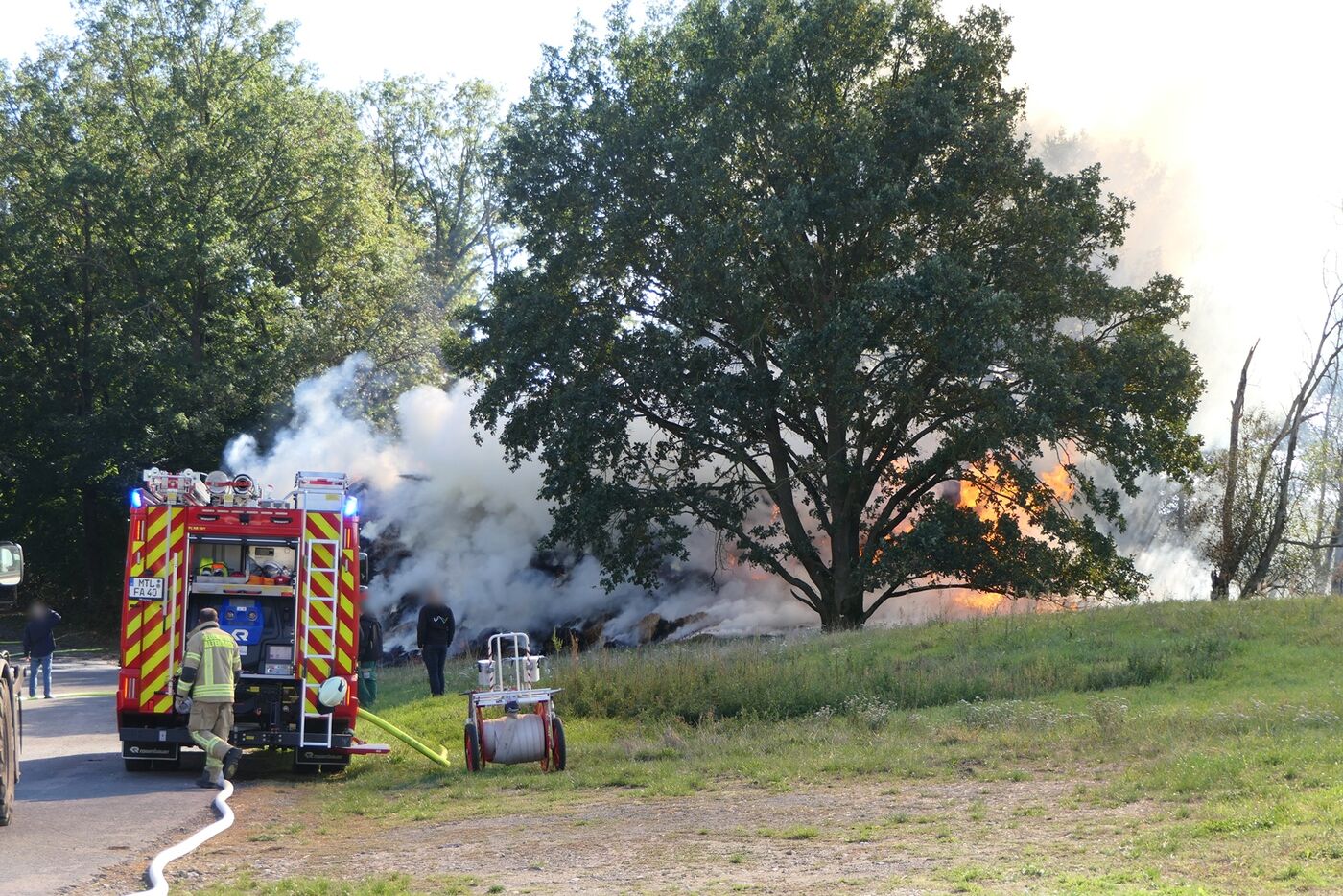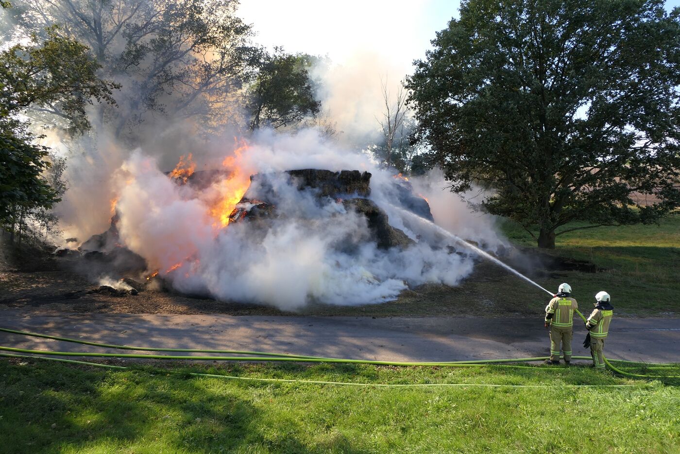 - Feuerwehrleute halten den Schlauch auf den brennenden Strohhaufen.