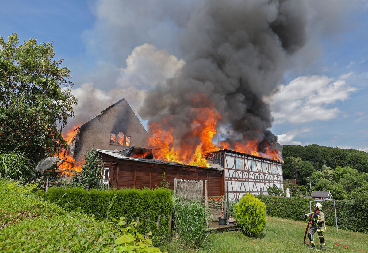 Erstmeldung vom 14.07.23, 16:15 Uhr: Feuerwehr-Großeinsatz in einem Vierseitenhof in Wüstenbrand. Wie unser Reporter vor Ort berichtet, wurden die umliegenden Feuerwehren gegen 13:15 Uhr alarmiert. Da standen zwei Scheunen lichterloh in Flammen. Sie waren nicht mehr zu retten. Bei dem Großeinsatz wurden zwei Kameraden verletzt. Zehn Anwohner wurden vom Rettungsdienst betreut. Im Einsatz waren 100 Feuerwehrleute mit 23 Fahrzeugen.