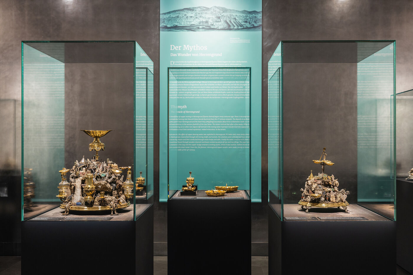 Die mehr als 70 Exponate beleuchten den chemischen Prozess, bei dem sich Eisengegenstände unter Tage in Kupfer verwandelt haben - das Rote Gold. Gezeigt wird außerdem aufwendig gestalteter Tischschmuck, den Kunsthandwerker mit vergoldeten Mineralien verziert haben.