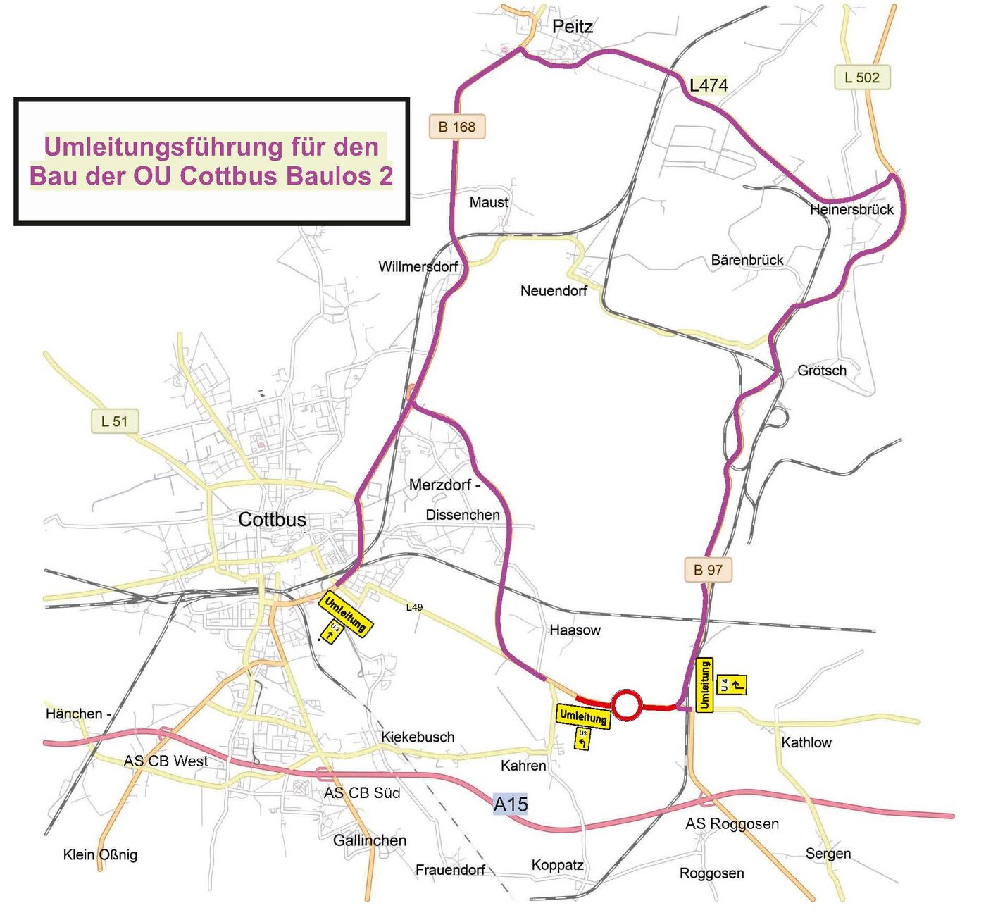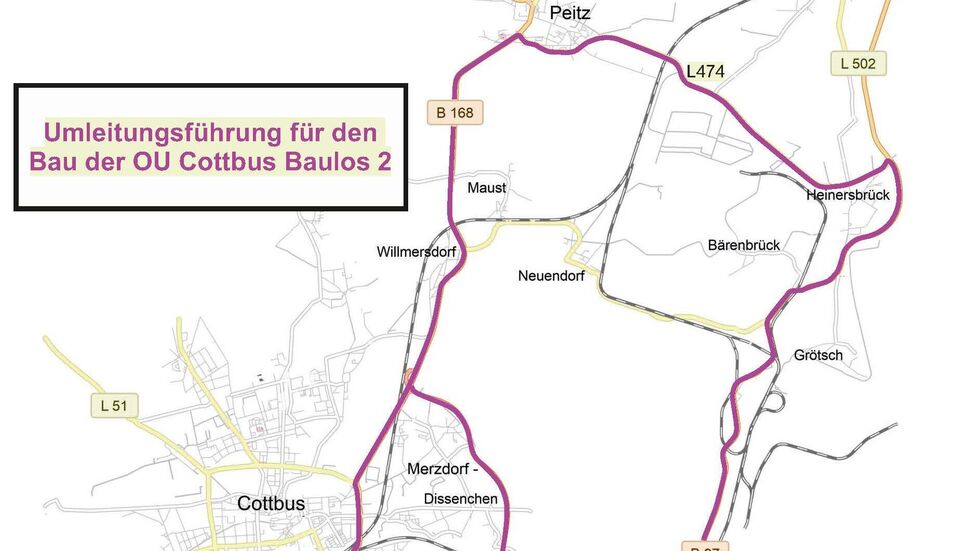 Grünes Licht für den nächsten Bauabschnitt der Ortsumgehung Cottbus. Die Vorbereitungen sind abgeschlossen, in den nächsten Tagen sollen die Arbeiten starten, teilte die Stadtverwaltung mit. Errichtet wird ein neuer Knotenpunkt der B168 zwischen dem Abzweig nach Kahren und der Faunabrücke. Auch drei neue Brücken entstehen auf dem 2,4 Kilometer langen Streckenabschnitt. Für die Arbeiten muss die Bundesstraße voll gesperrt werden. Eine Umleitung über Hainersbrück und Peitz ist eingerichtet.