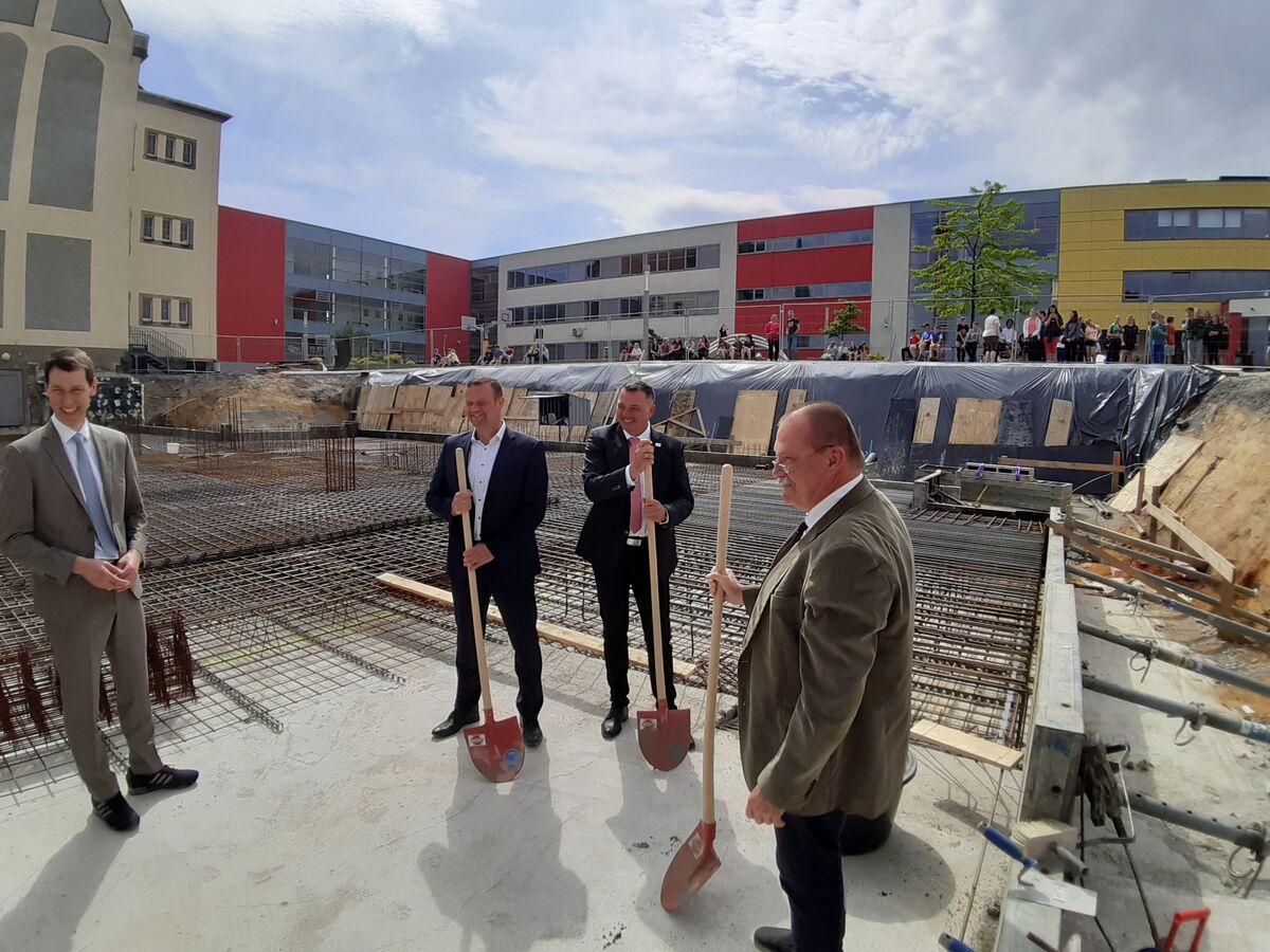 Bürgermeister Stefan Schneider (2.v.l.), Landrat Udo Witschas (2.v.r.) und Schulleiter Ulrich Schlögel (r.) im Beisein von Béla Bélafi (l.) vom Kultusministerium bei der Grundsteinlegung.