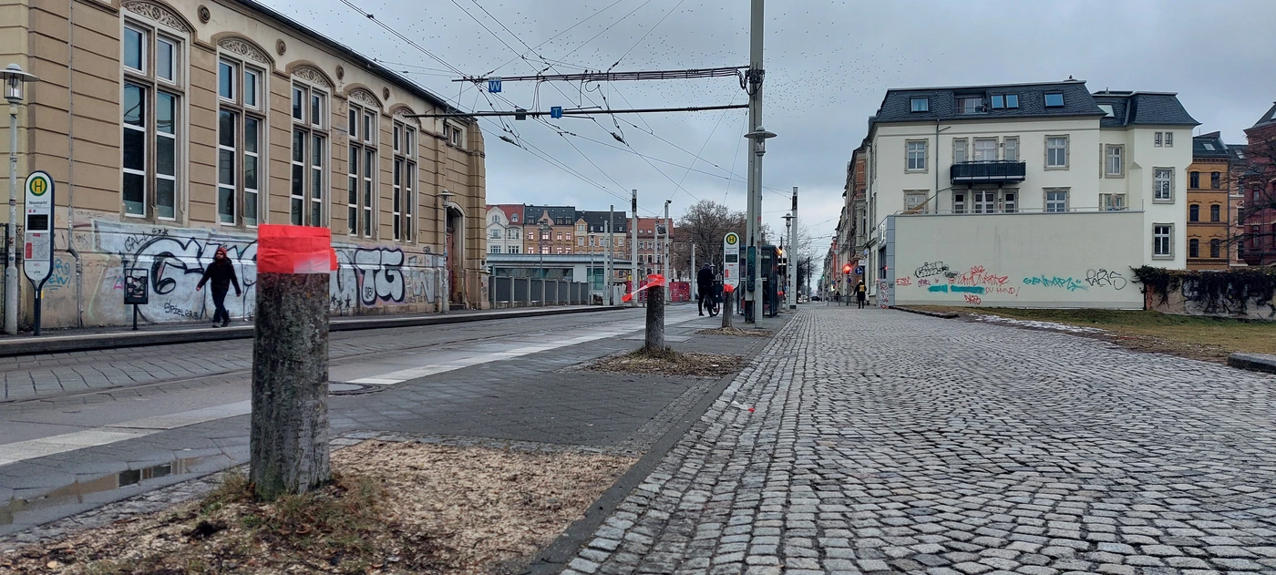 Am Neumarkt in Zwickau wird ab April der Bahnsteig überdacht. Dafür mussten kürzlich sieben Hainbuchen an der Leipziger Straße weichen.