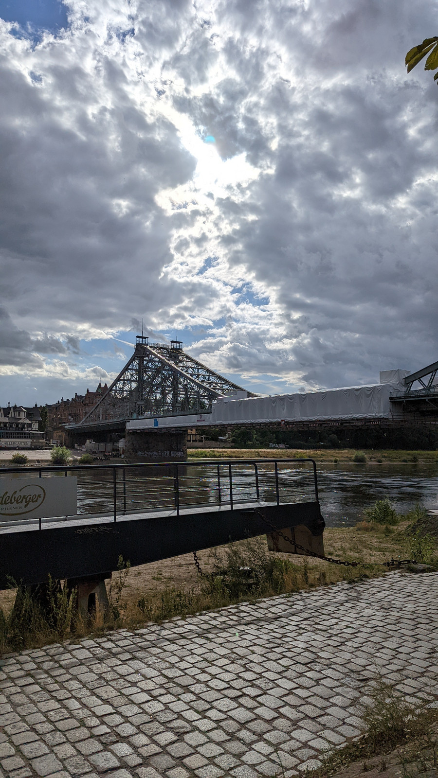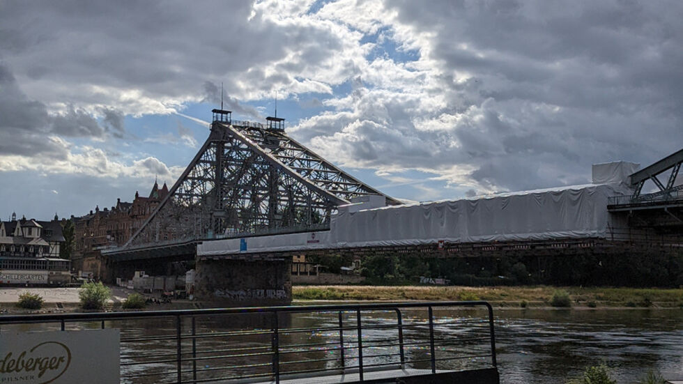 Halbzeit bei der Vollsperrung am Blauen Wunder. Bis Ende August werden die Fahrbahnübergangskonstruktionen gebaut und an den Randbereichen mit Sandstrahlen die alte Farbe abgetragen. Die Bauarbeiten laufen nach Plan. Nach den Sommerferien ist dann wieder je eine Spur pro Fahrtrichtung geöffnet. Im Oktober soll der erste Teil der Brücke mit dem neuen Farbanstrich enthüllt werden.