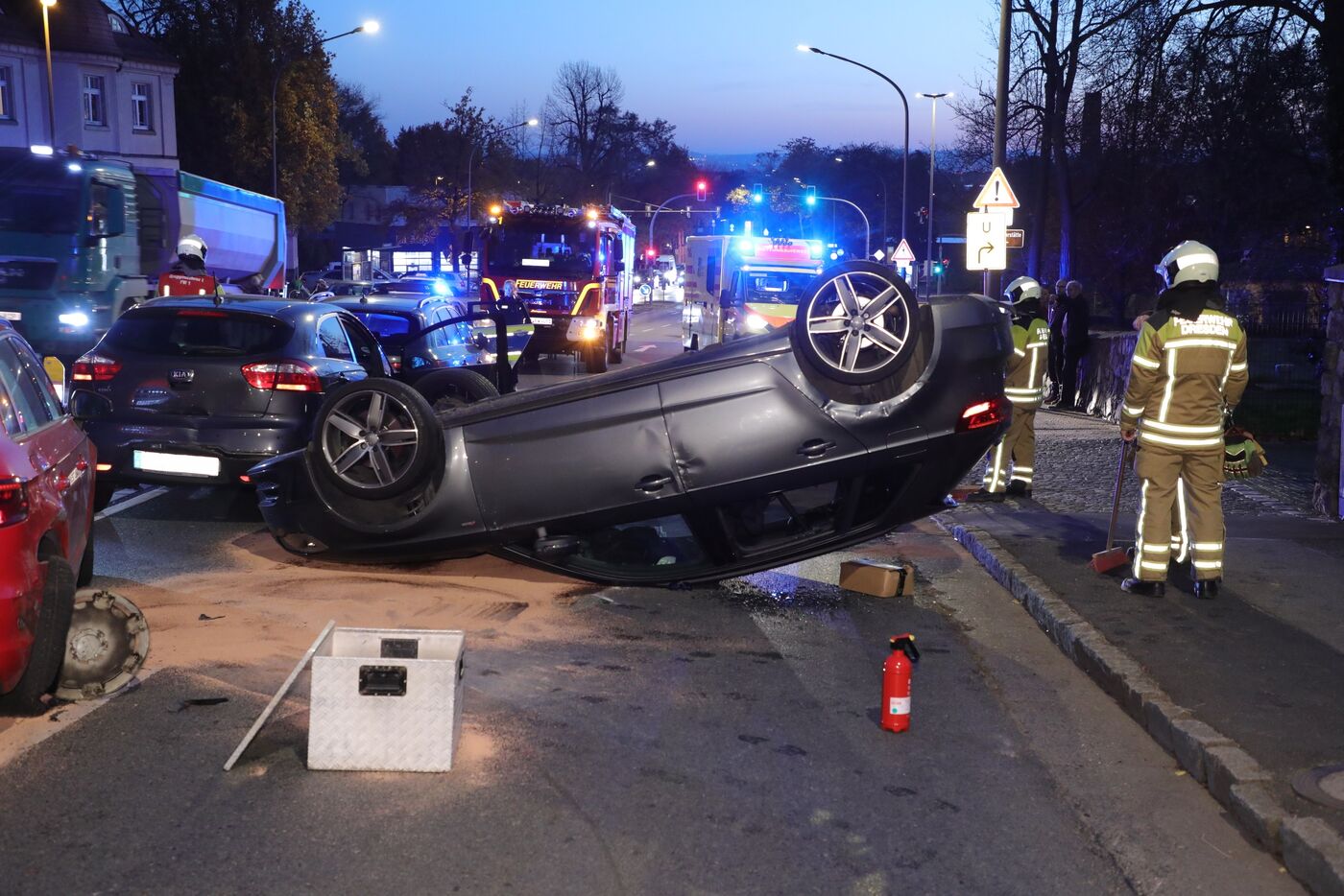 Bei einem Auffahrunfall auf der Radeburger Straße in Dresden hat sich ein PKW überschlagen - drei Menschen sind beim Unfall verletzt worden.