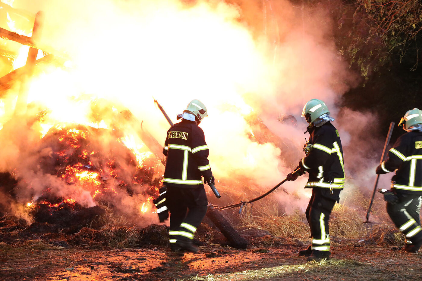 Das Heulager brennt lichterloh. Feuerwehrleute kämpfen gegen die Flammen an