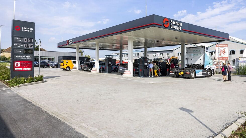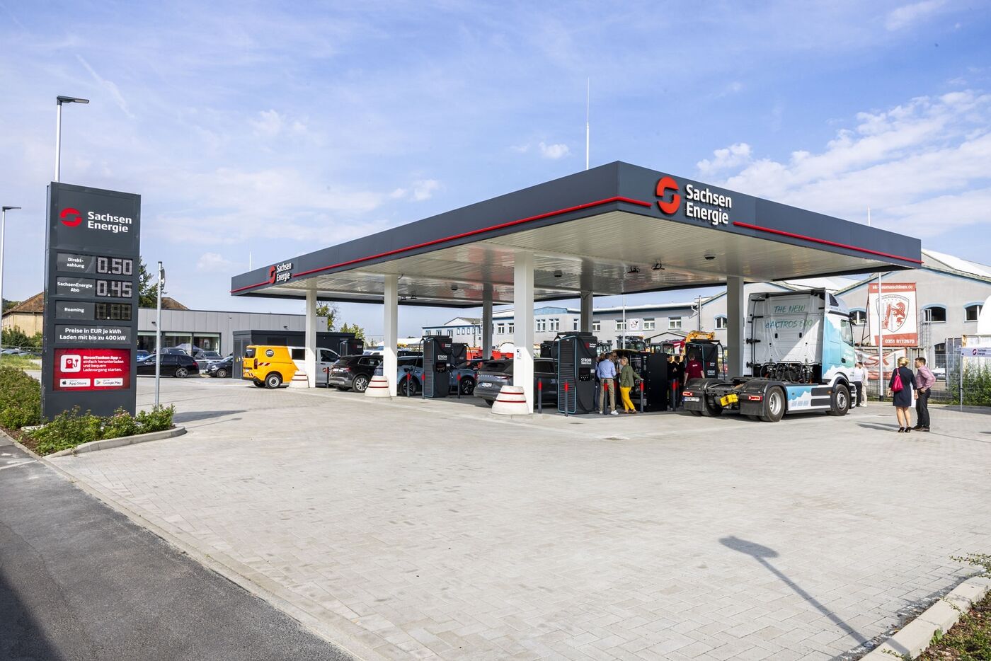 Der Ladepark verfügt über zwölf HPC-Schnelladepunkte. Mit einer Ladeleistung von bis zu 400 Kilowatt setzt Sachsen Energie auf die aktuell am Markt leistungsstärkste Ladetechnologie. In lediglich 15 Minuten kann das E-Auto bis zu 300 Kilometer Reichweite nachladen. Die im Einfahrtsbereich gut sichtbare Preisanzeige weist rund um die Uhr transparent die aktuellen Ladepreise aus.