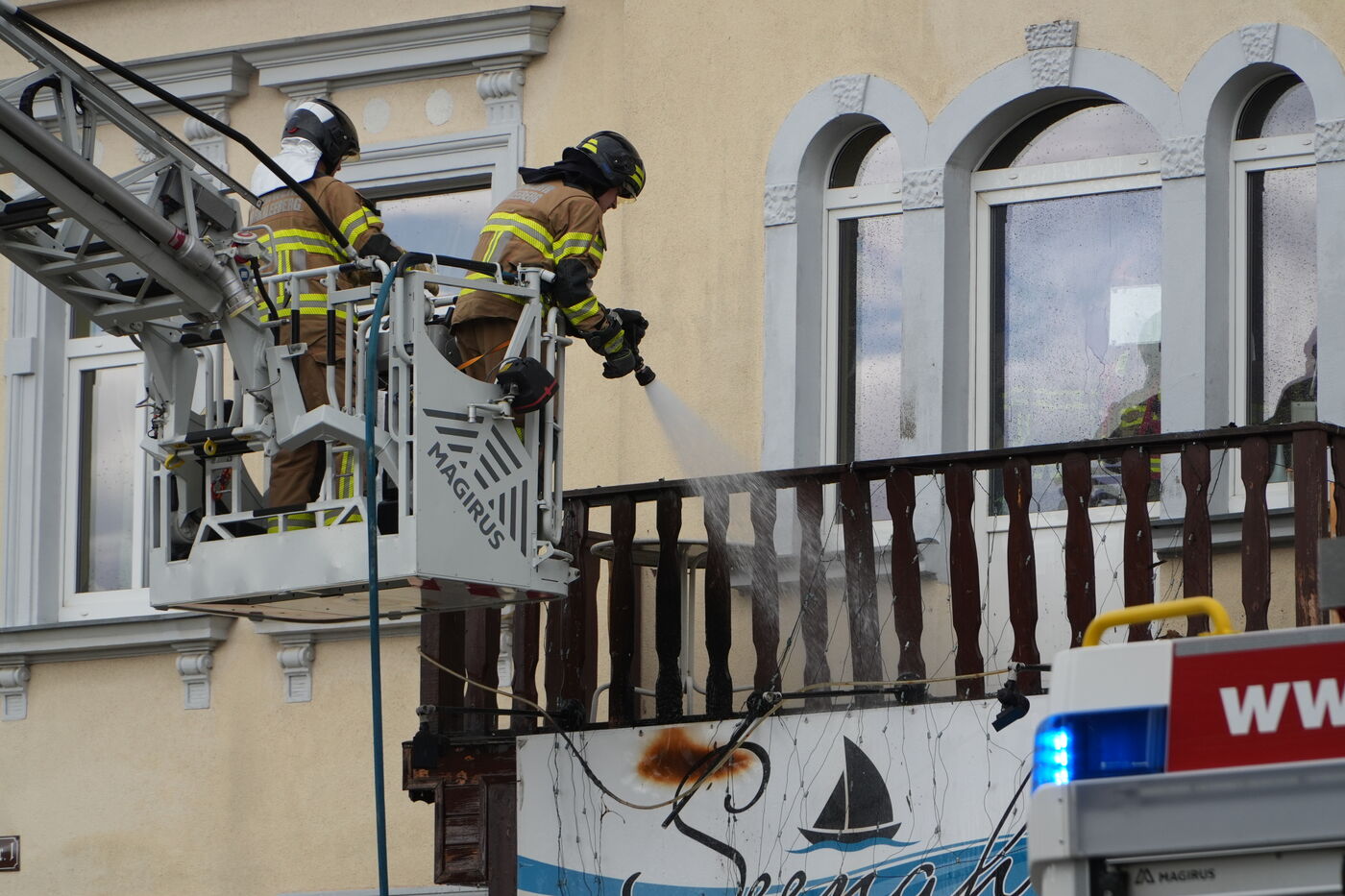 Feuerwehrleute beim Löschen von der Drehleiter aus.