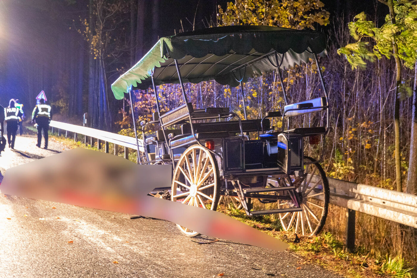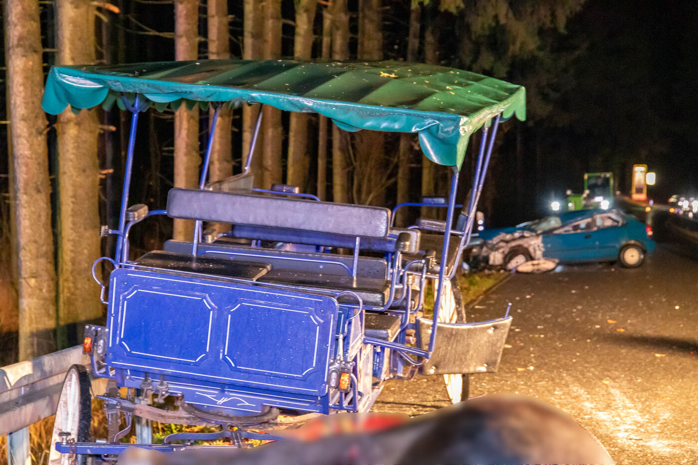 UPDATE: Laut Polizei hatte ein 35-jährige Hondafahrer einen vor ihm fahrenden Pkw überholt und war dabei frontal in die Pferdekutsche gekracht. Bei dem Unfall wurden fünf Menschen verletzt. Der Autofahrer, der 63-jährige Kutscher und ein 49-jähriger Fahrgast erlitten schwere Verletzungen. Zwei weitere Insassen der Kutsche wurden leicht verletzt. Der Sachschaden wird auf 25.000 Euro geschätzt.