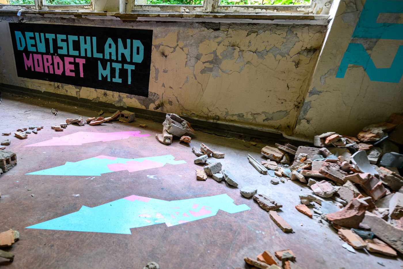 «Deutschland mordet mit» steht in einer Arbeit von Luke Carter auf dem Streetart-Festival Ibug in Chemnitz. Das Ibug-Festival hat in diesem Jahr laut Veranstaltern einen neuen Besucherrekord erreicht. (Archivbild)