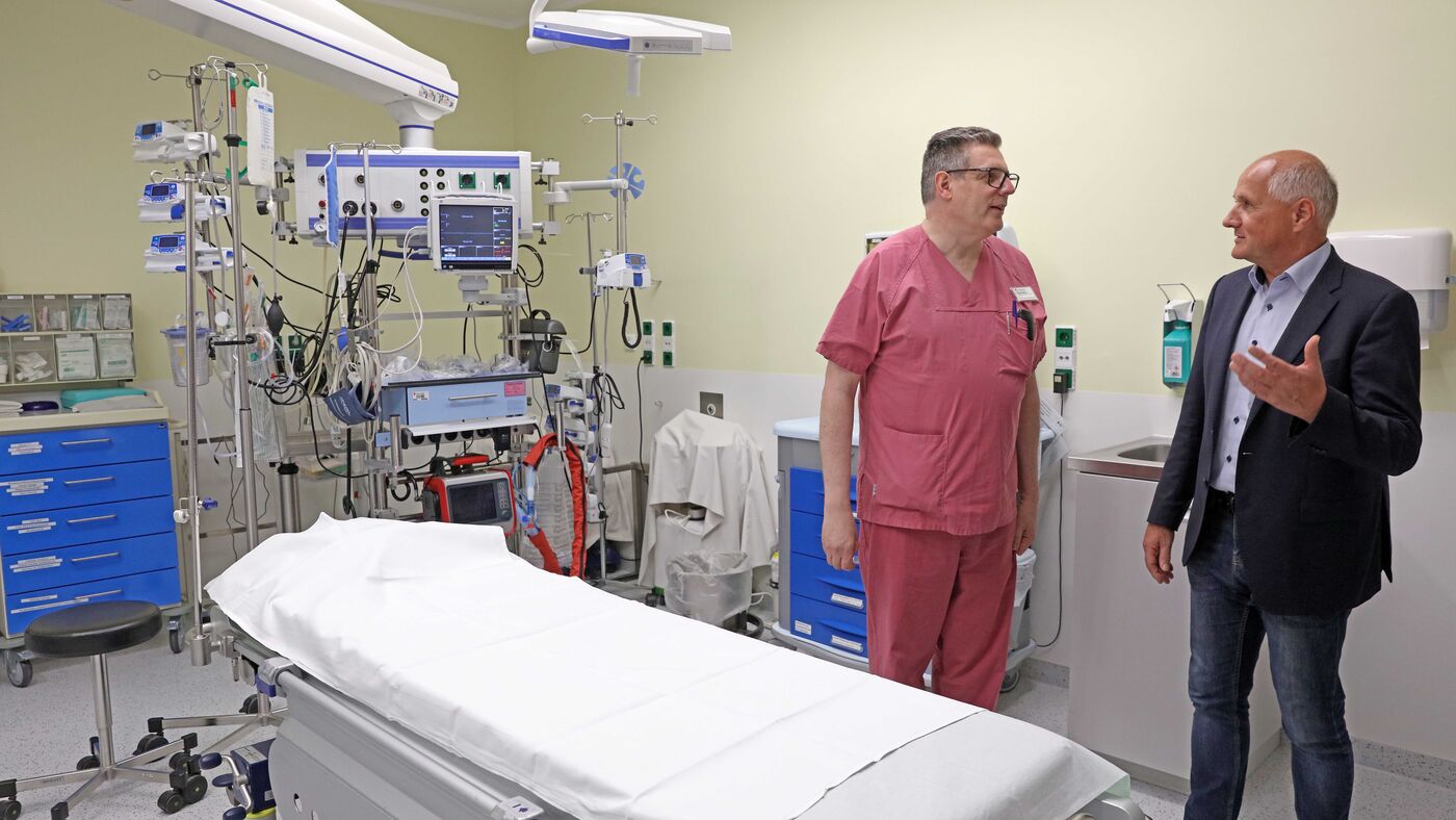 Pflegeleiter Matthias Reuschel (l.) im neuen Schockraum im Gespräch mit Bürgermeister Jochen Fankhänel