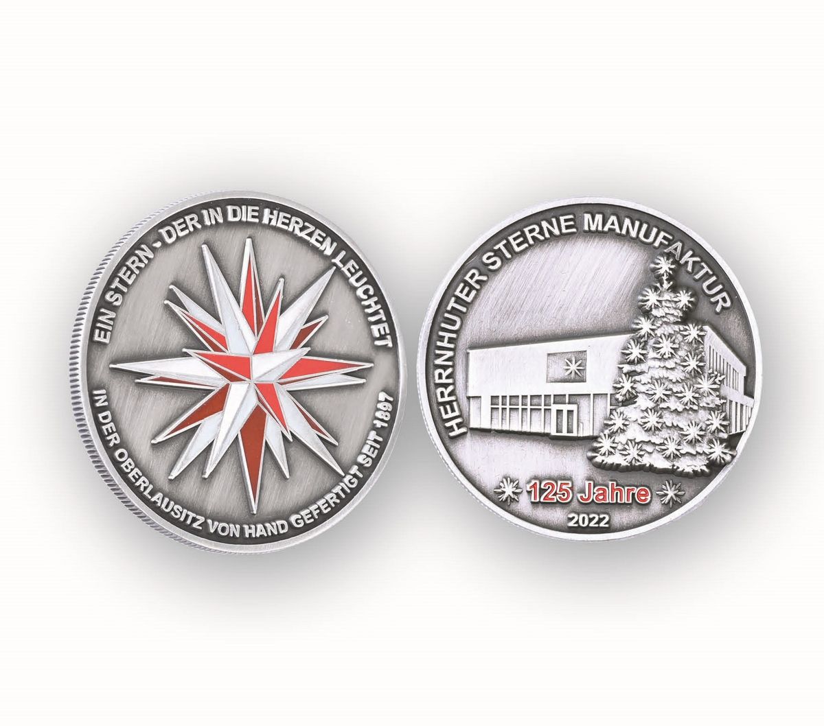 Auf der einen Seite der Medaille ist das Manufakturgebäude mit einem Weihnachtsbaum dargestellt, auf der anderen Seite ein Herrnhuter Stern in den Ursprungsfarben Weiß-Rot abgebildet. Die Messingmedaille mit Silberlegierung mit einer Auflage von 500 Stück ist ab morgen (24.11.) erhältlich ( Preis 16 Euro).