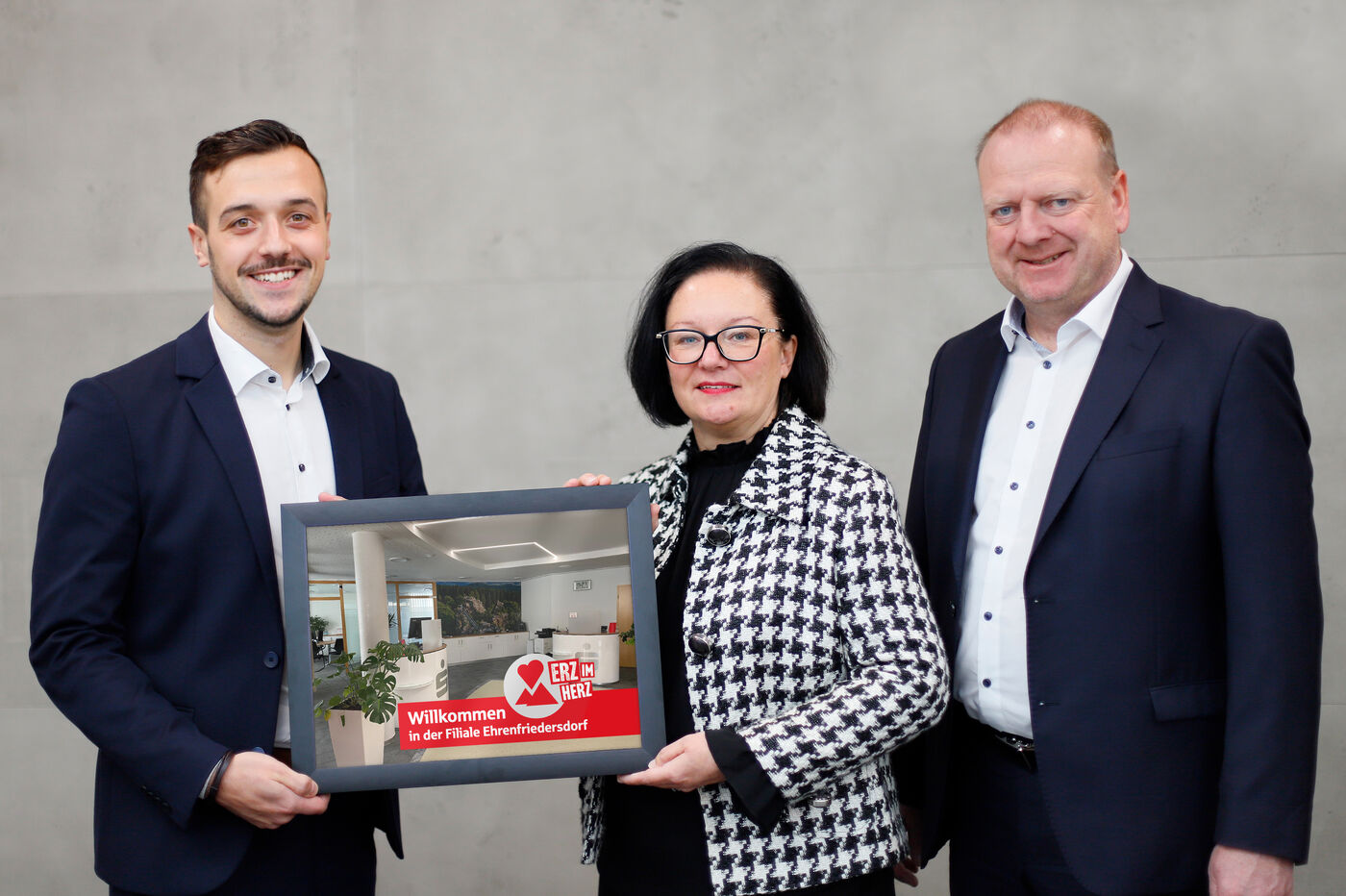 - (v.l.n.r.): William Trültzsch (neuer Fili- alleiter Filialgebiet Ehrenfriedersdorf), Manuela Willimowski (Vorstandsmitglied), Kai Grunert (Bereichsleiter S-Privatkunden).