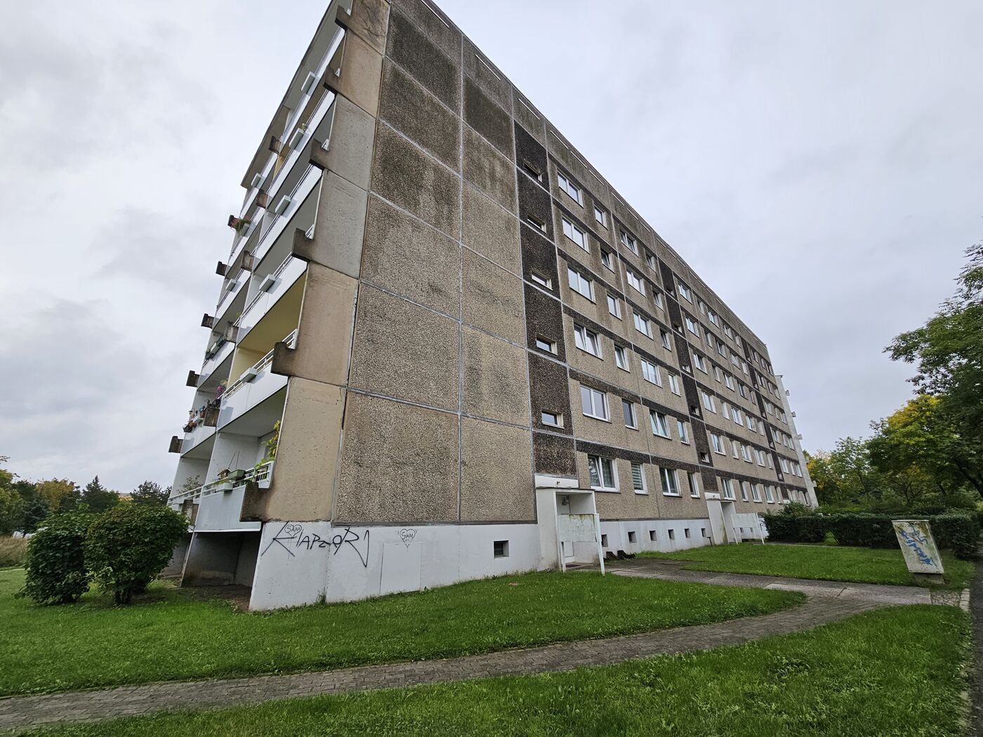 Der graue Plattenbau am Schönauer Ring in Leipzig, hier hat es am Sonntagabend im Keller gebrannt.