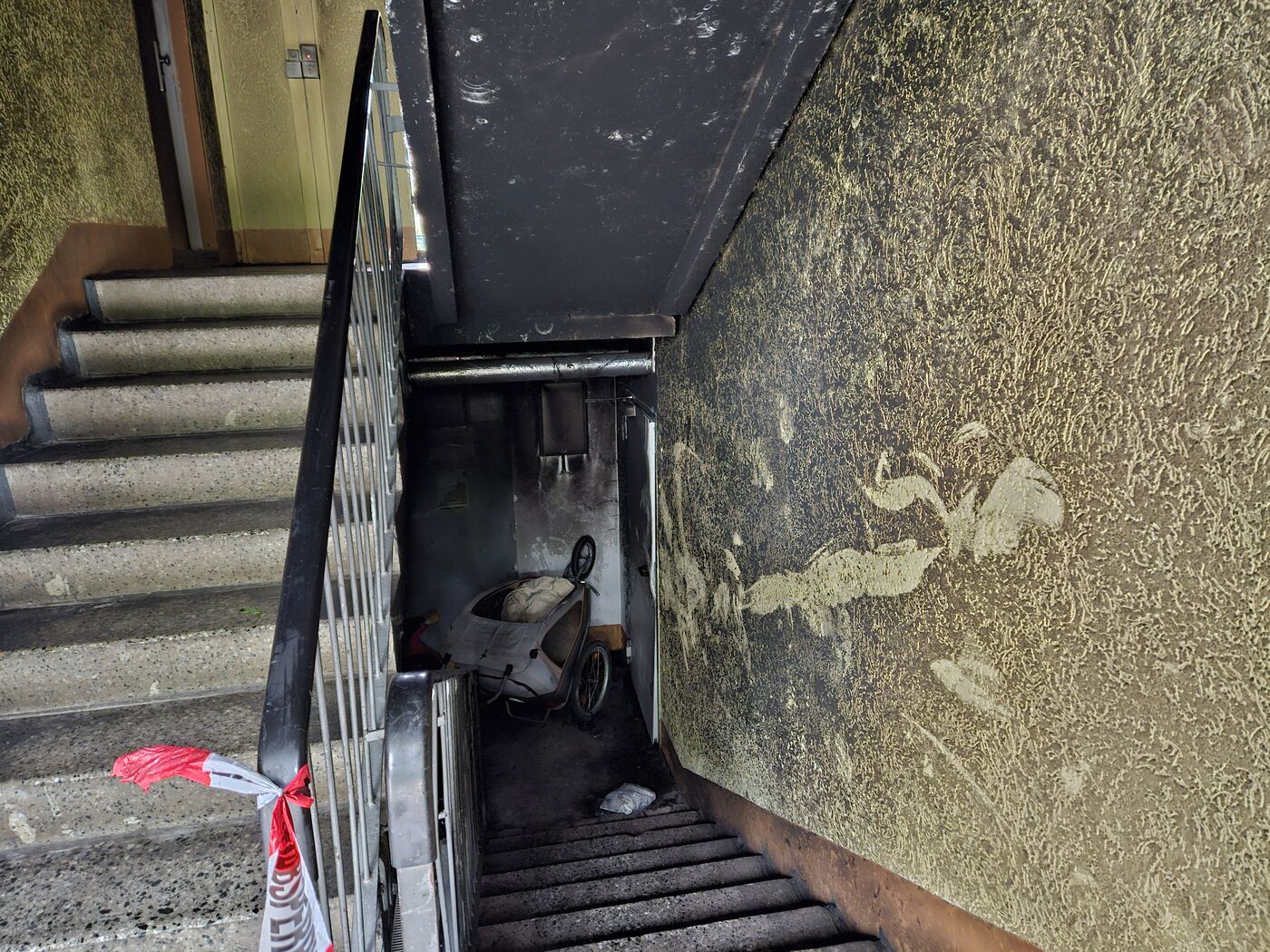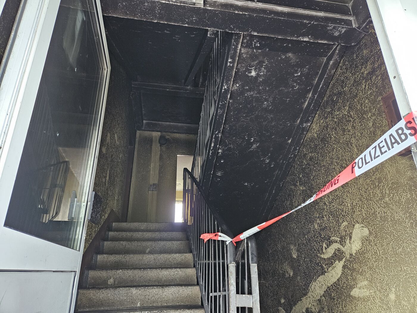 Das Treppenhaus in dem Plattenbau wurde bei dem Brand großflächig verrußt.