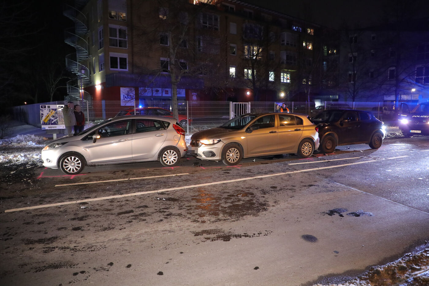 Den Angaben zufolge waren ein Ford Fiesta (Fahrerin 68), ein Fiat Tipo (Fahrerin 63) und ein Nissan Juke (Fahrerin 49) zwischen der Autobahnauffahrt Hellerau und der Ludwig-Kossuth-Straße unterwegs. An einer roten Ampel stoppte die 68-Jährige den Ford. Hinter ihr hielt die 63-Jährige mit dem Fiat. Die 49-Jährige fuhr mit dem Nissan auf den Fiat auf und schob diesen auf den Ford.