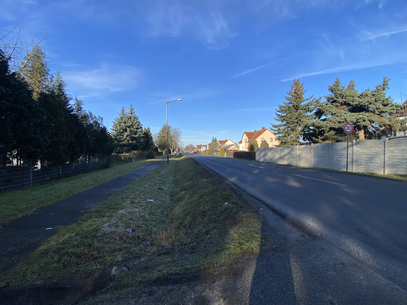 - Kurz nach dem Ortseingang Leipzig (aus Richtung Taucha) wurde im Dezember eine neue Tempo-30-Zone ausgewiesen (Schild ganz rechts). Zur Begründung heißt es, dass sich daneben ein Schulweg befinden würde. Doch der ist, wie man hier sieht, noch nicht mal an der Straße - dazwischen befindet sich noch ein Graben.