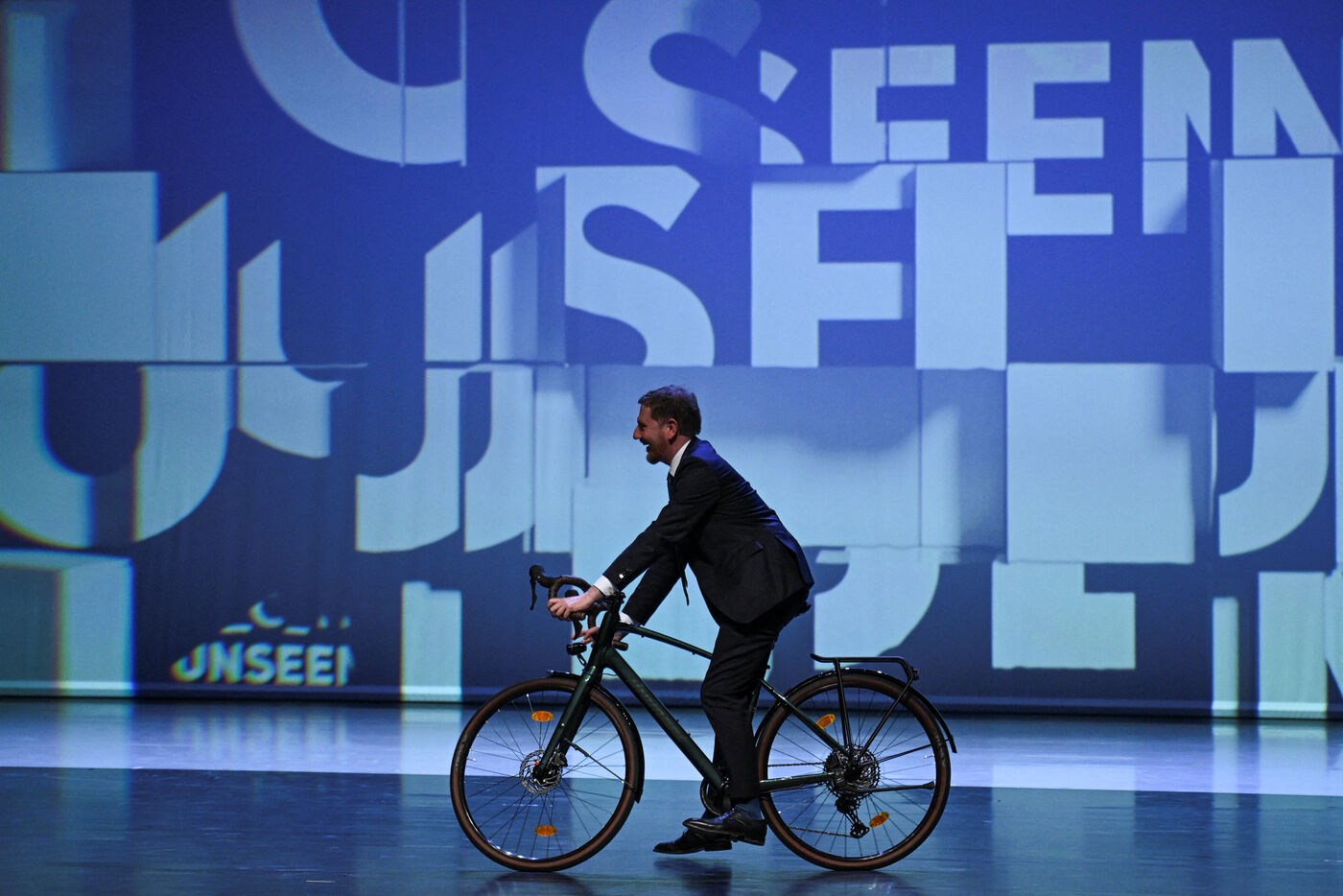 Sachsens Ministerpräsident Michael Kretschmer (CDU) fährt mit dem Fahrrad auf die Bühne vor dem offiziellen Festakt zur Eröffnung