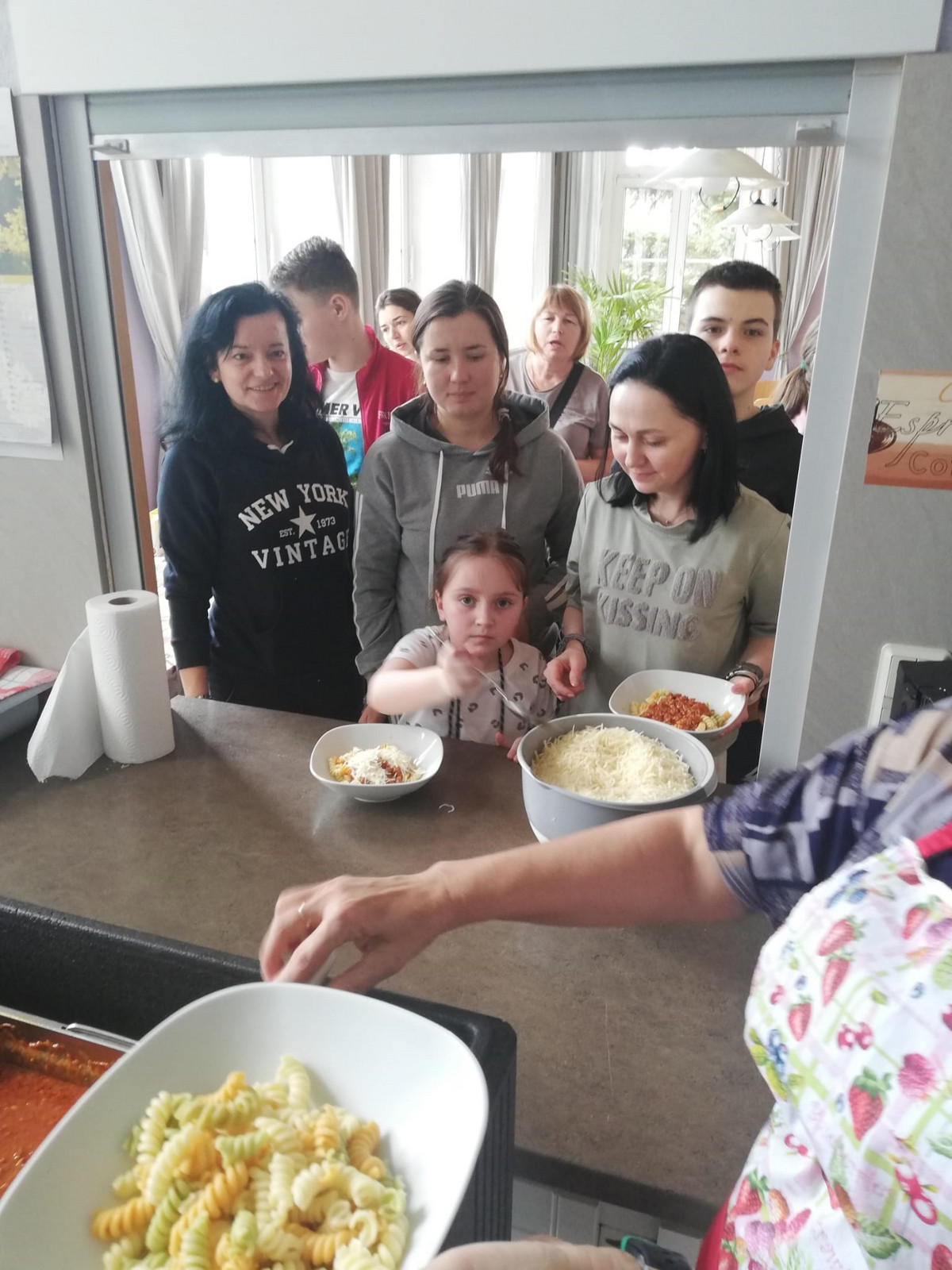Essensausgabe für die neu angekommenen Frauen und Kinder aus Ternopil im Schullandheim Neukirch/ Lausitz