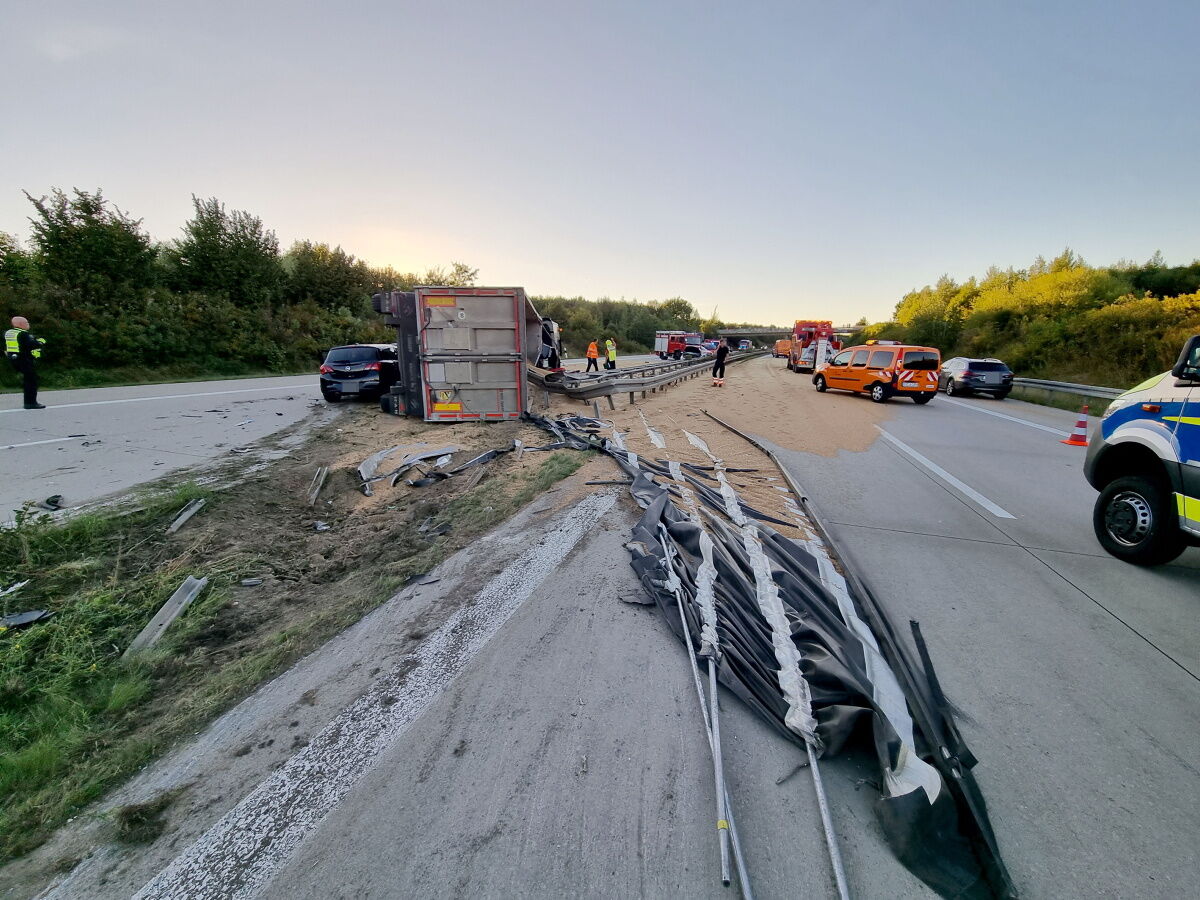 Bei einem Unfall auf der A72 zwischen Hartmannsdorf und Niederfrohna hat ein Getreidelaster die Mittelleitplanke durchbrochen und ist umgekippt. Der tschechische LKW war am Dienstagabend Richtung Leipzig unterwegs, als bei ihm plötzlich ein Reifen platze, so die Polizei.