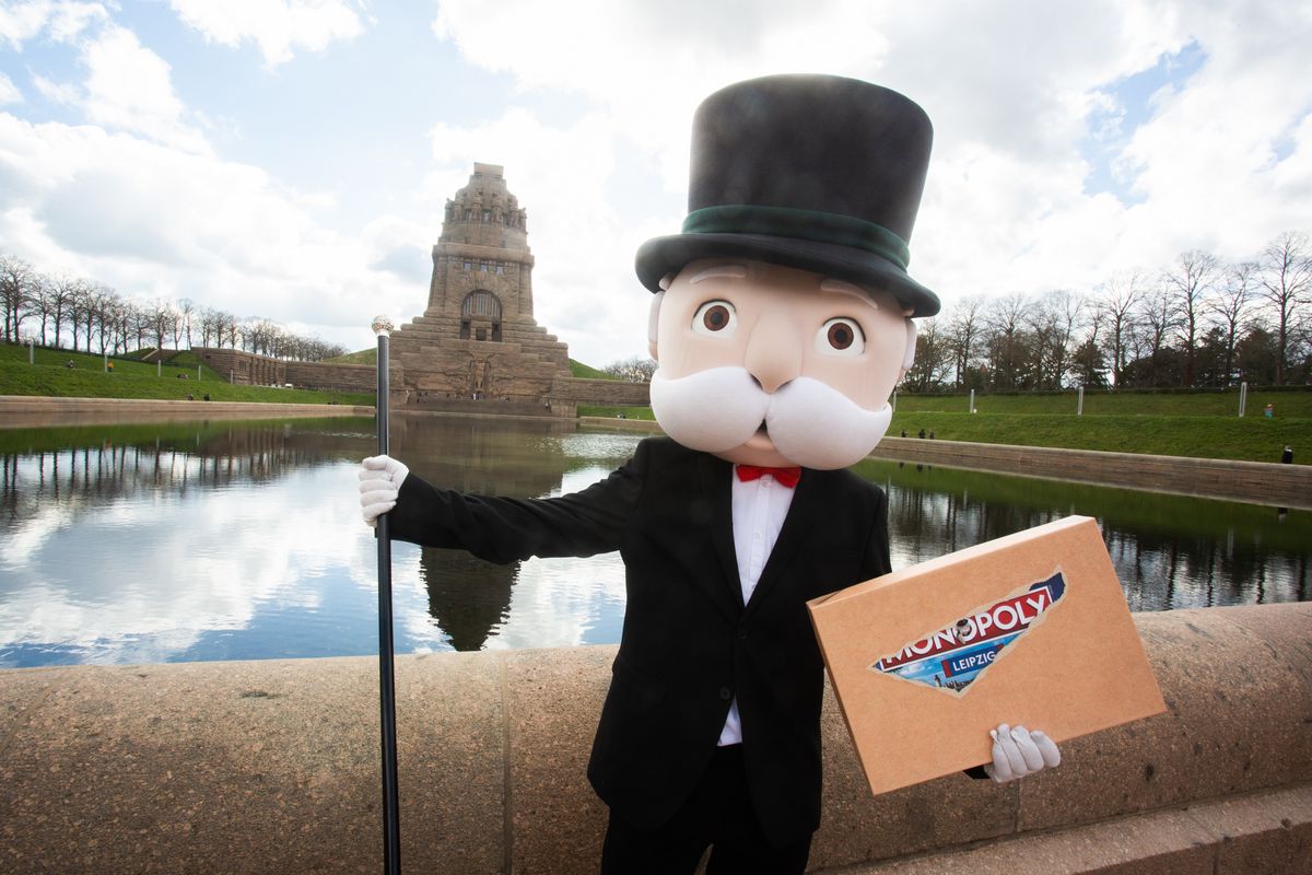 - Mr. Monopoly mit der Leipzig-Edition vor dem Völkerschlachtdenkmal