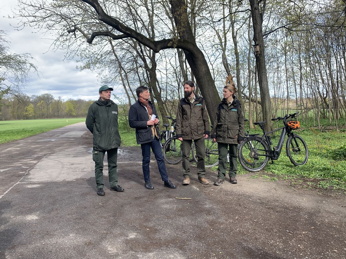 Leiter der Stadtforstabteilung Andreas Sickert, Umweltbürgermeister Heiko Rosental, Stadtwaldranger Marko Reimann und Franka Seidel