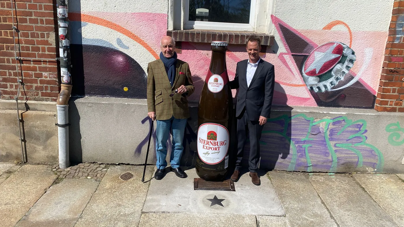 Stolz steht Freiherr Wolf Dietrich Speck von Sternburg, der Ur-Ur-Ur-Enkel vom Gründer der Sternburg-Brauerei (Maximilian Speck von Sternburg, 1822) am ersten Stern: Der 92-Jährige freut sich über die große Ehre, dass er am Donnerstagnachmittag als Erster auf einem Stern verewigt wurde - direkt vor der legendären Leipziger Brauerei an der Mühlstraße.