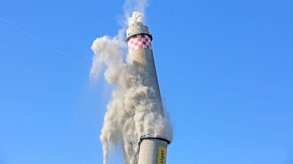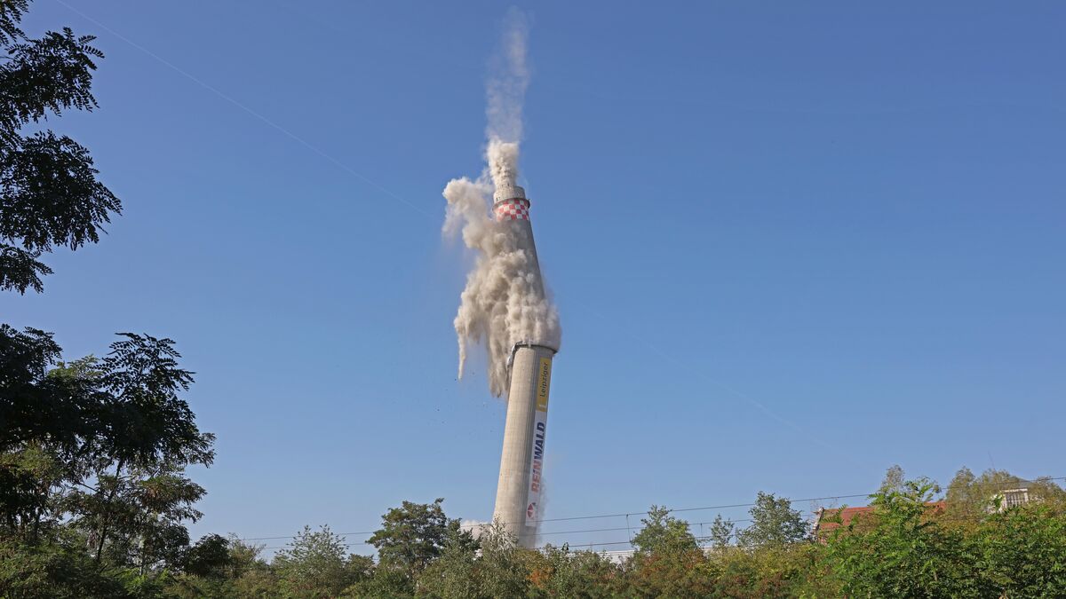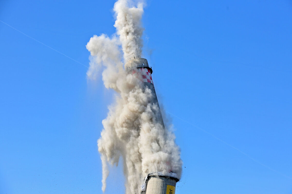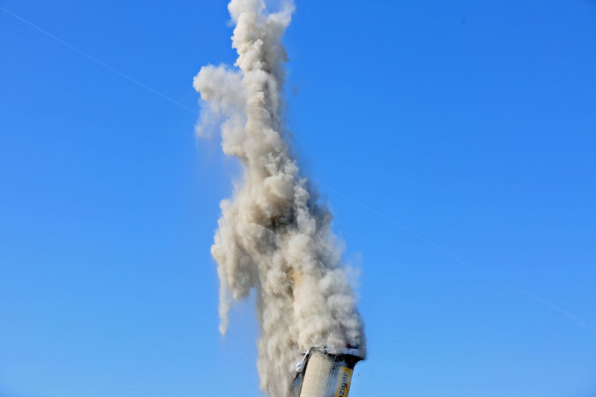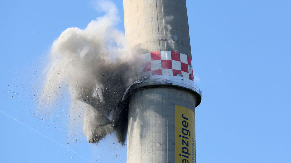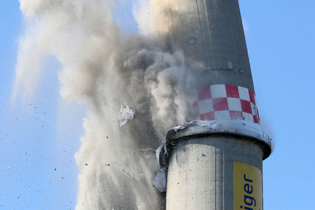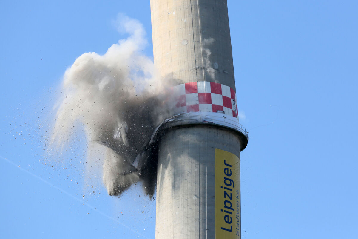 Der 170 Meter hohe Schornstein des früheren Heizwerkes „Max Reimann“ in Leipzig ist Geschichte. Um 10.11 Uhr fiel der Schlot am Sonntag nach einer Sprengung wie geplant in sich zusammen. Viele Einwohnerinnen und Einwohner der Stadt folgten dem Spektakel in der Nähe des Kraftwerkes. Noch Minuten später war an der Einsturzstelle eine dichte Rauchwolke zu sehen.