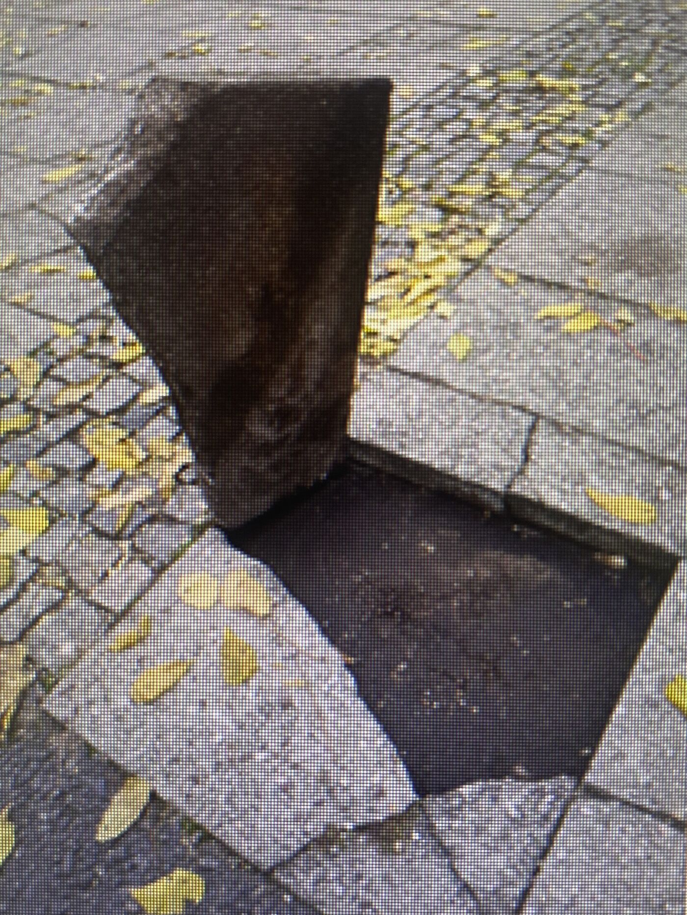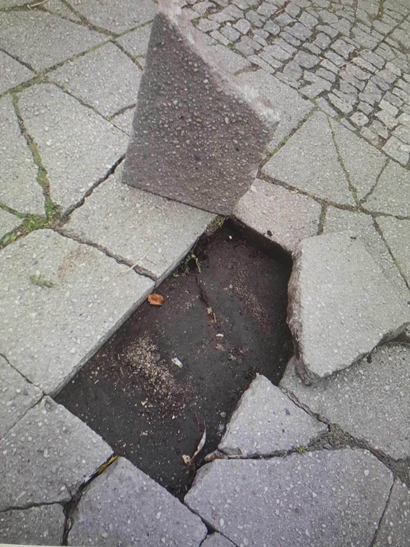 Ganze Gehwegplatten sind herausgebrochen und liegen lose herum.