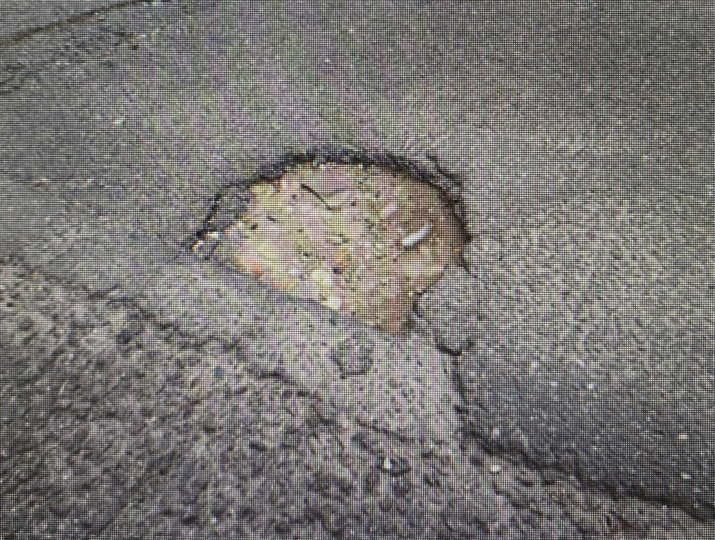 Das hier ist kein Dino-Fußabdruck, sondern ein großes Schlagloch auf dem Platz.